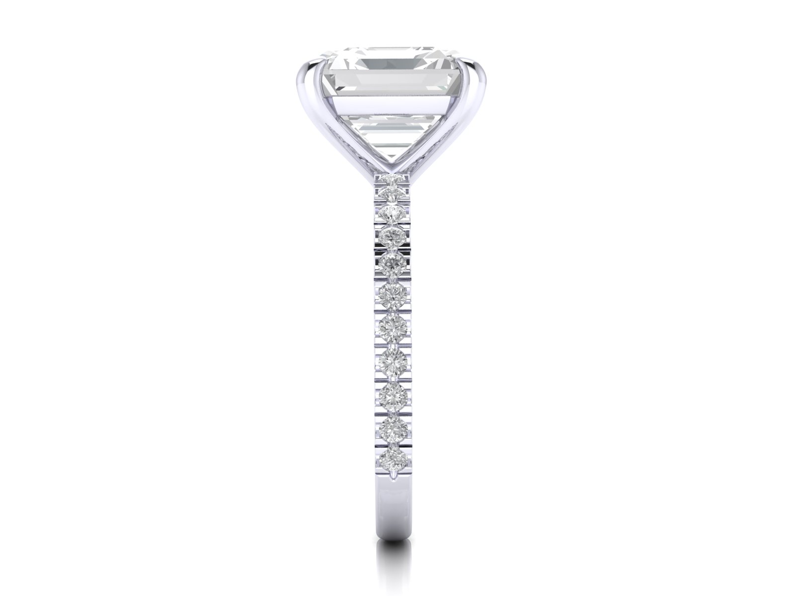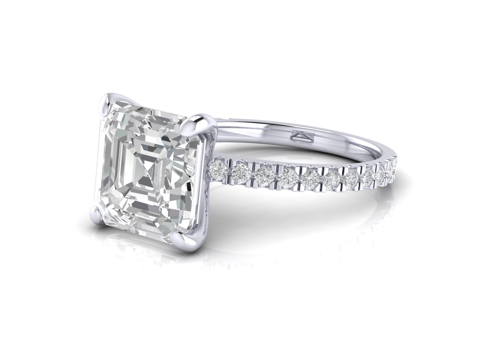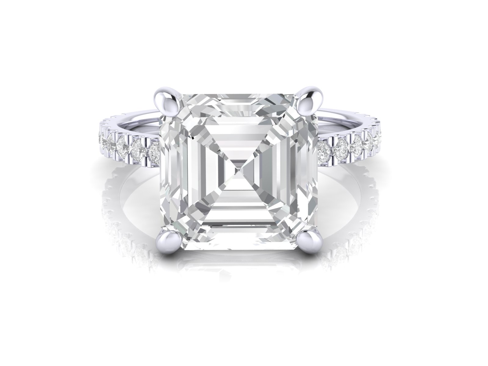 The bold and symmetrical asscher cut centre stone set on a diamond band.