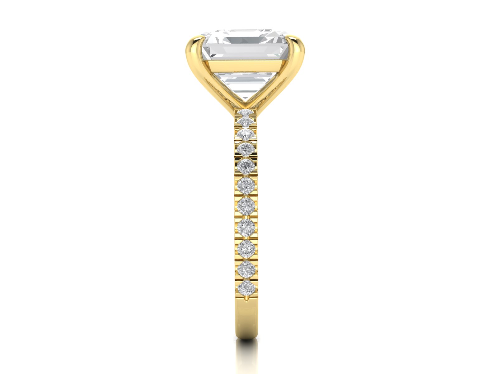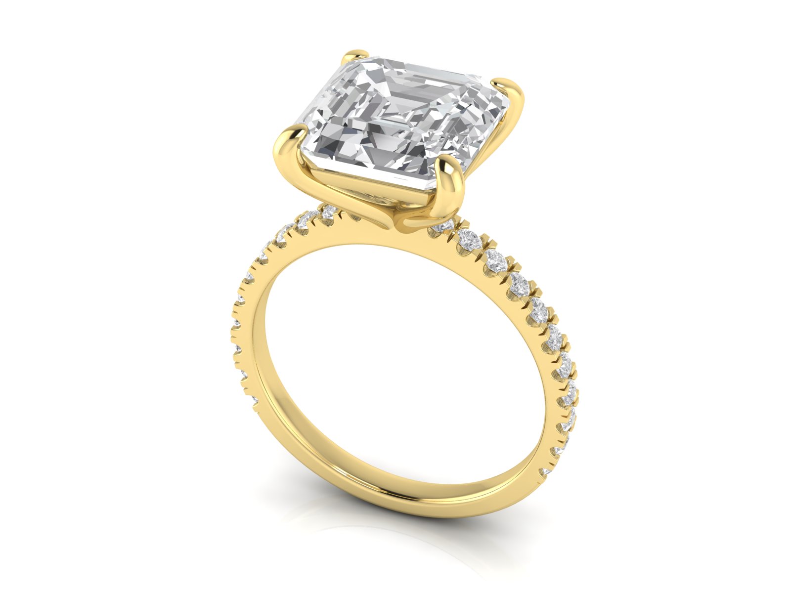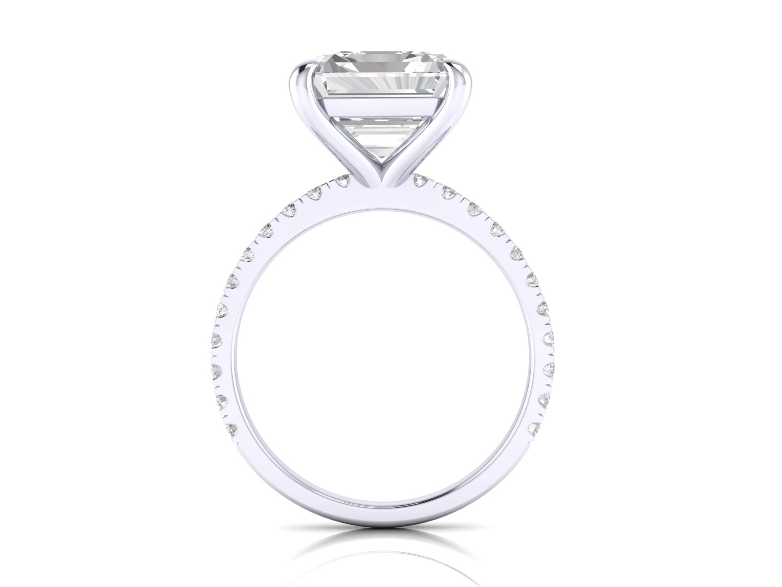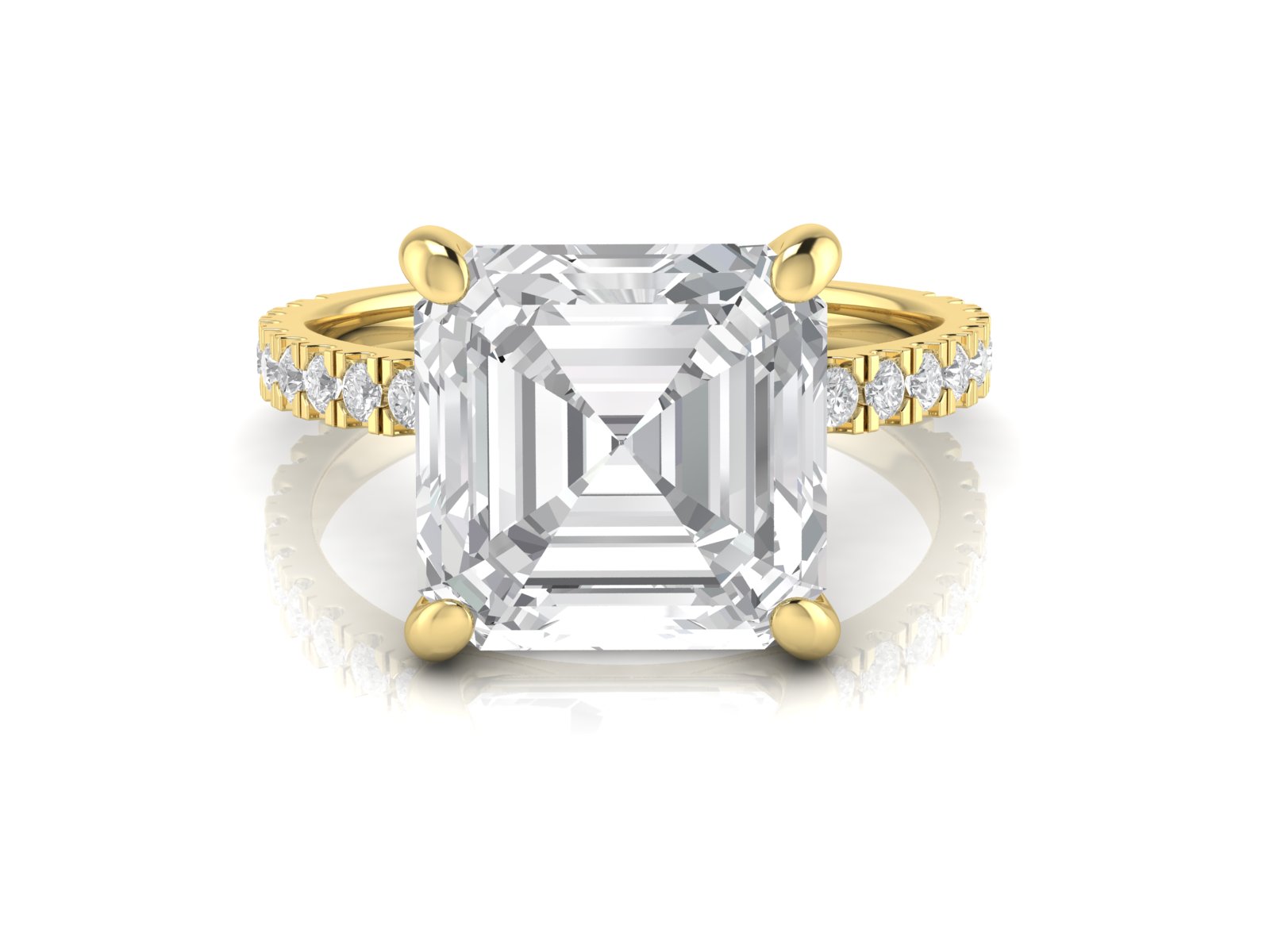 The bold and symmetrical asscher cut centre stone set on a diamond band.