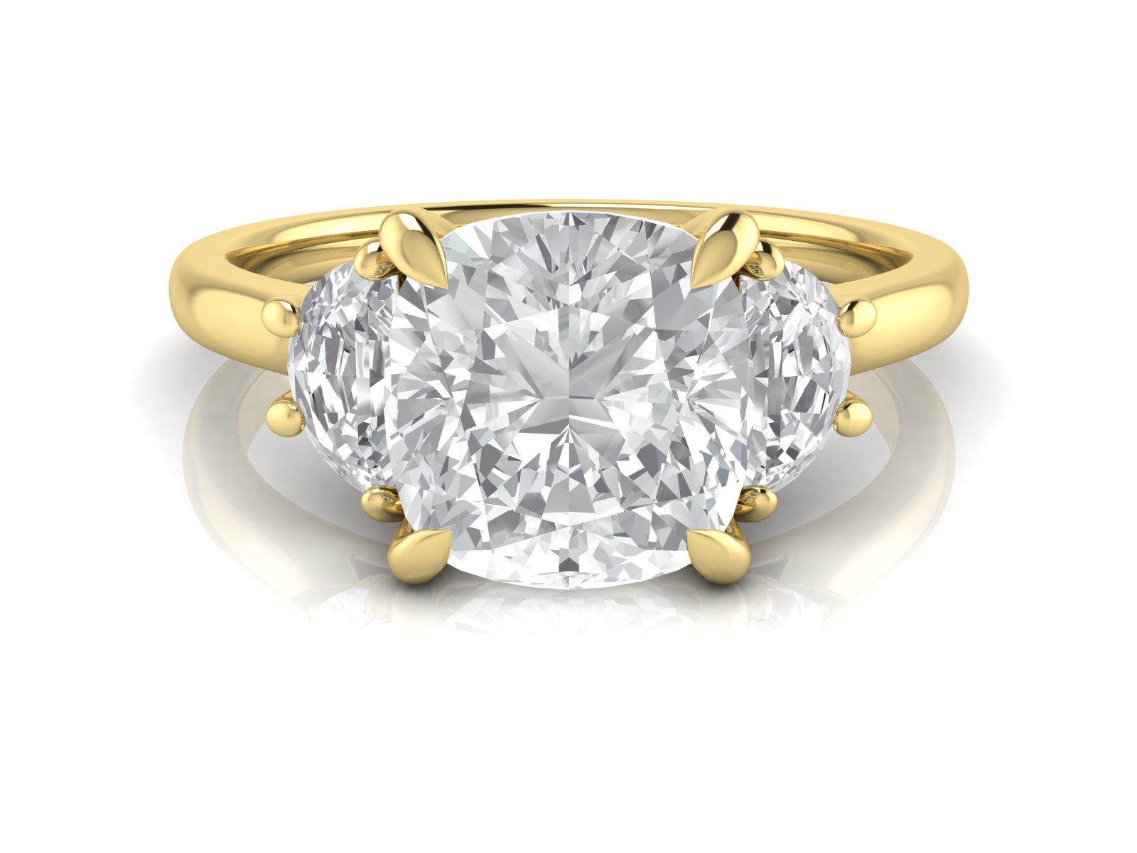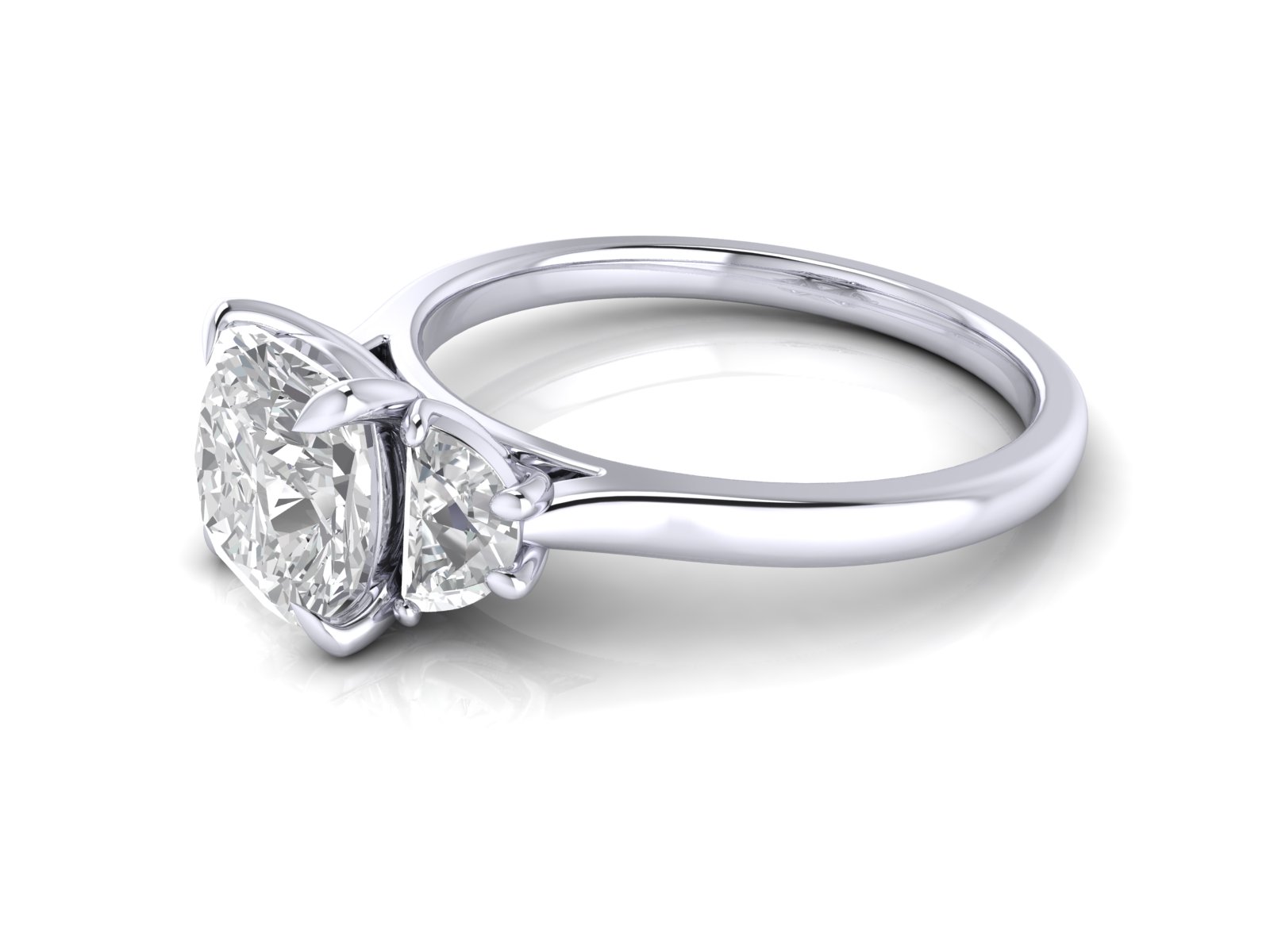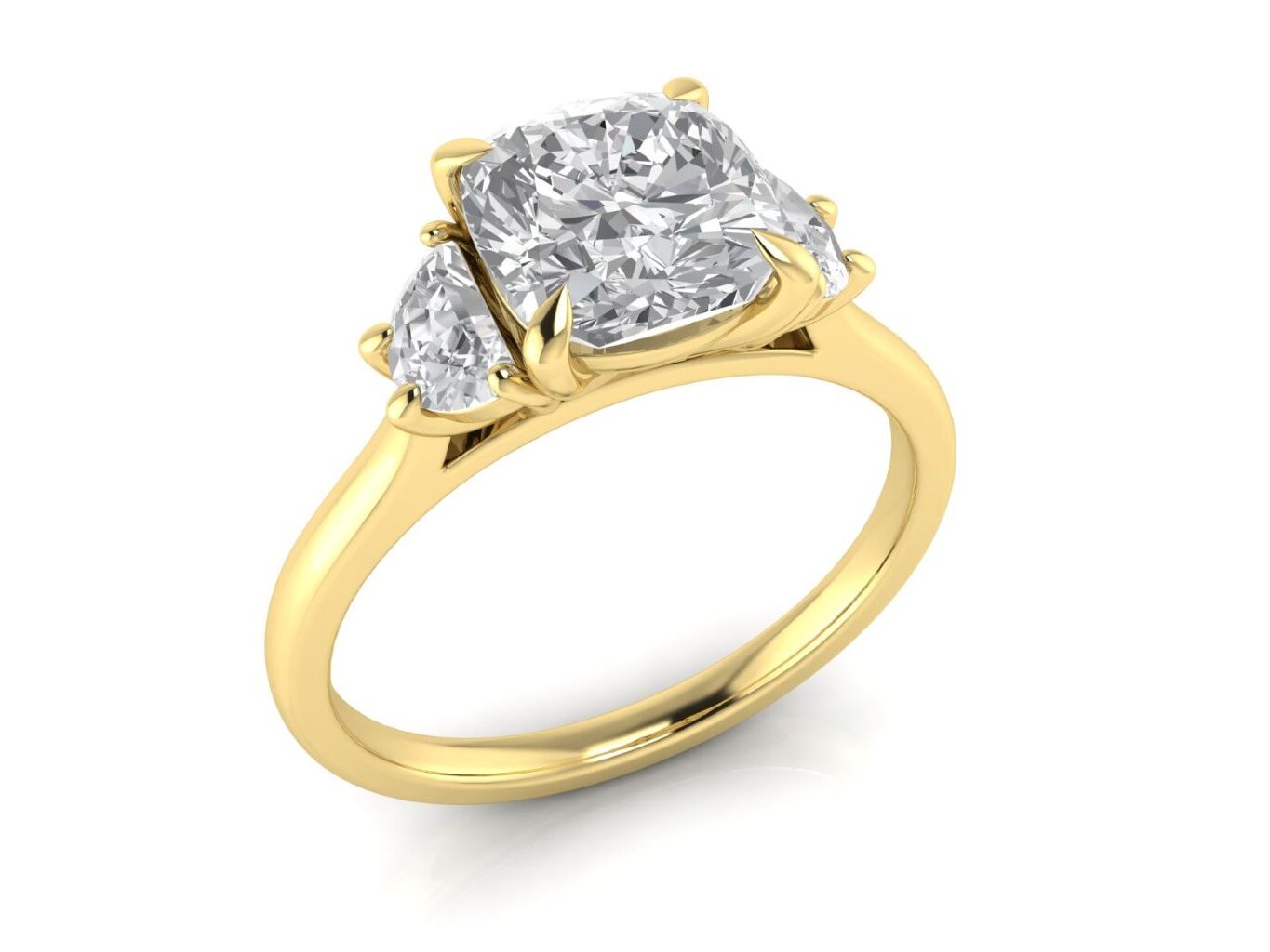 An elongated cushion centre stone paired with half-moon side stones for a soft, rounded silhouette. The curved side stones beautifully complement the curved edges of the cushion shape.