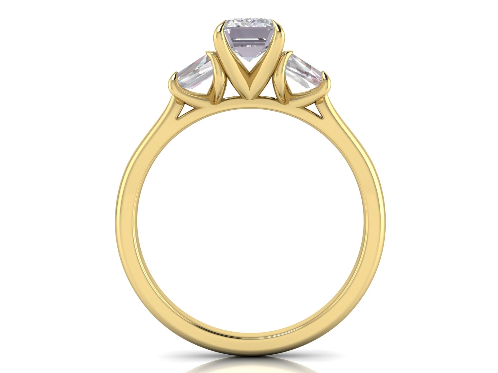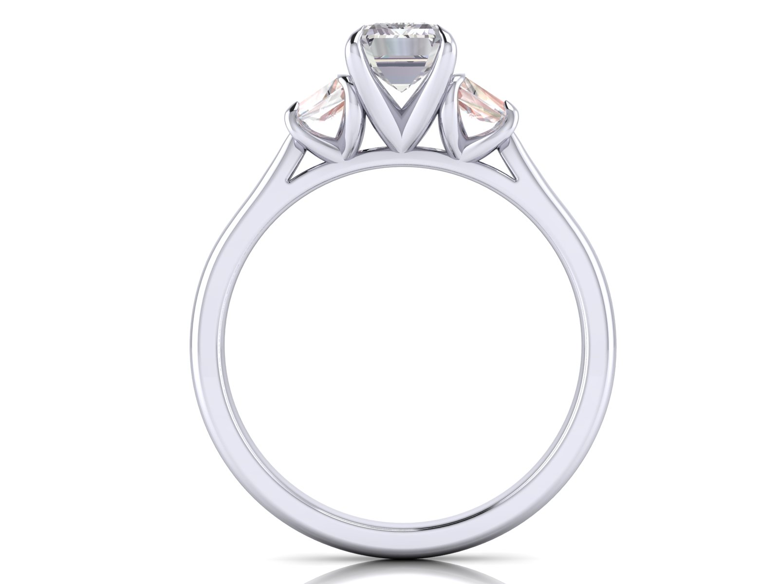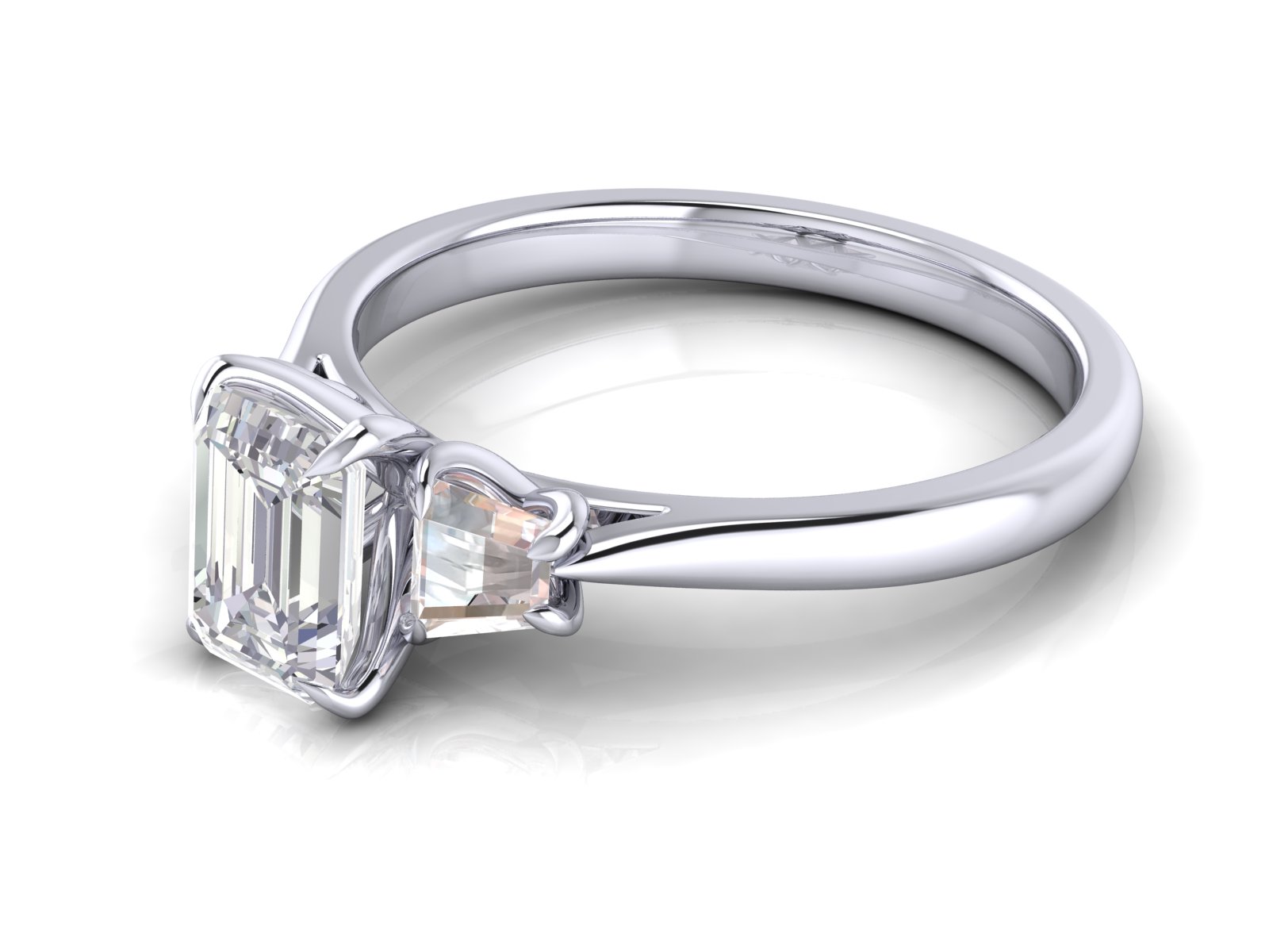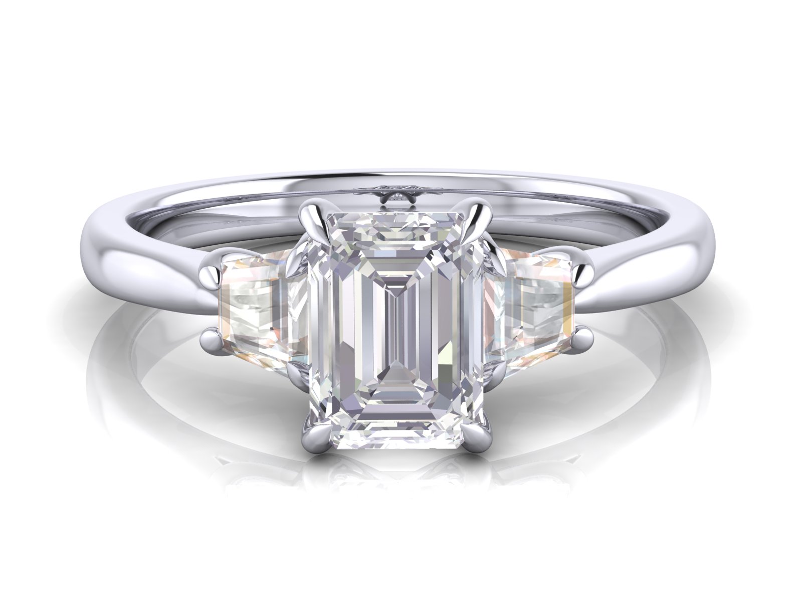 Description: A striking trilogy design featuring an emerald-cut centre stone accented by trapezoid side stones. The clean geometry of the side stones complements the emerald centre beautifully, creating a bold and sophisticated look.