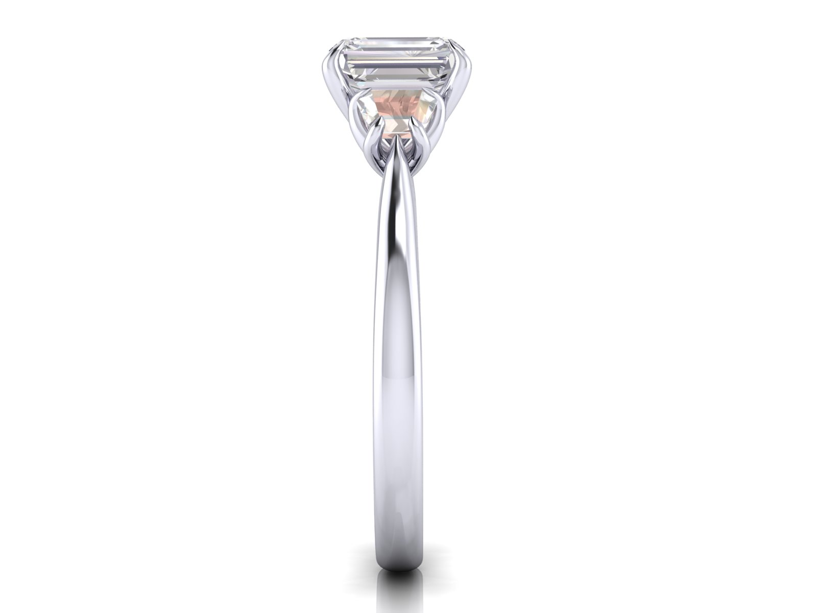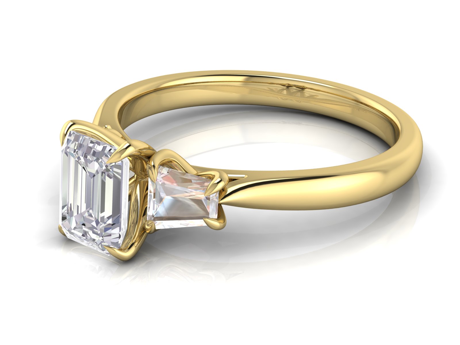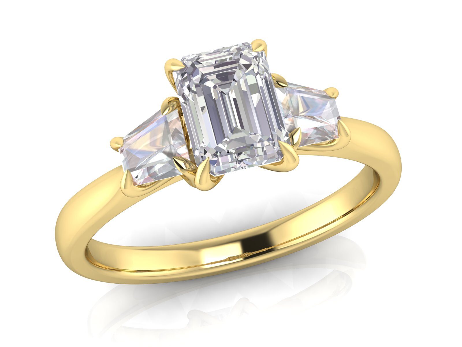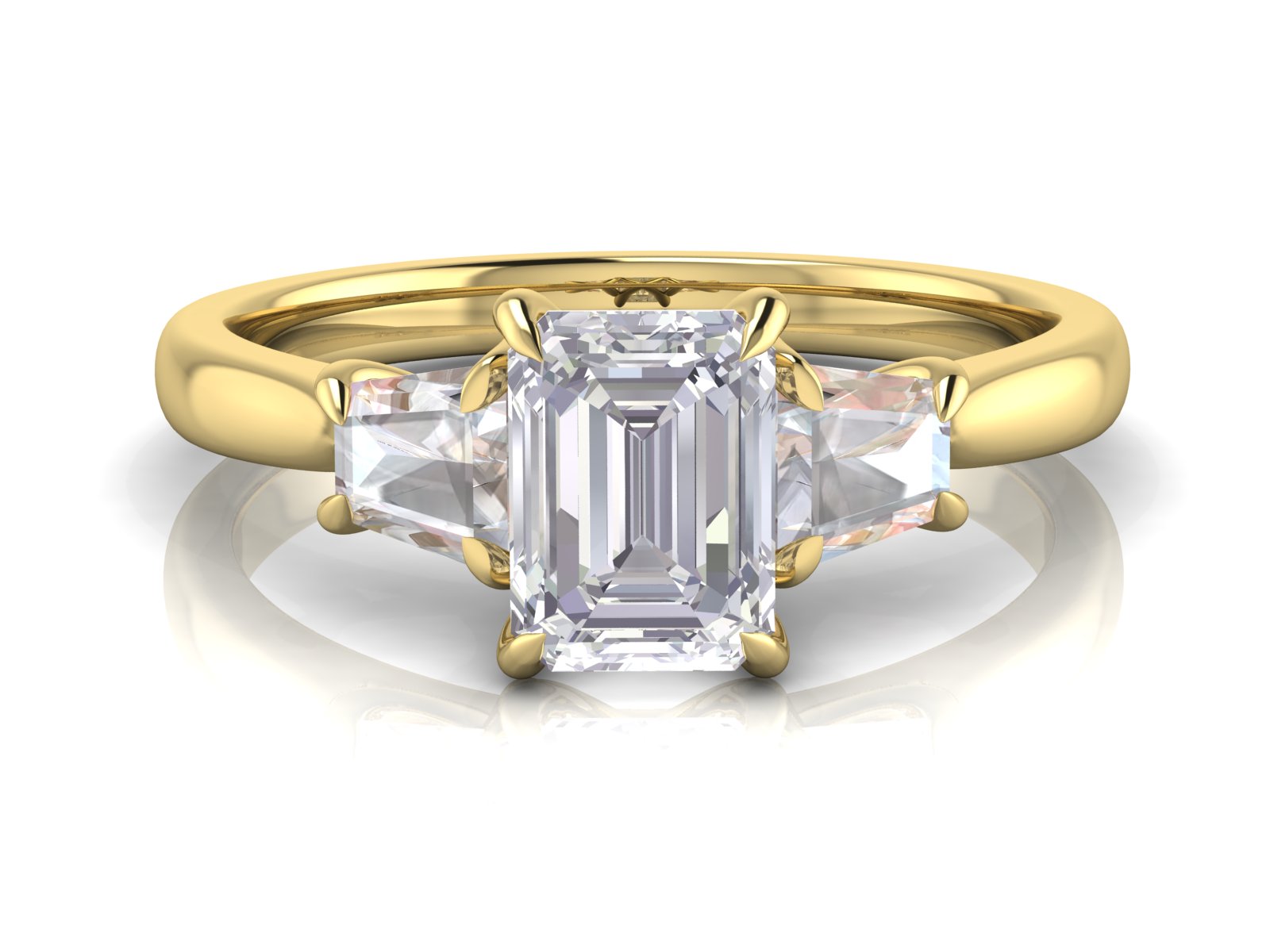 Description: A striking trilogy design featuring an emerald-cut centre stone accented by trapezoid side stones. The clean geometry of the side stones complements the emerald centre beautifully, creating a bold and sophisticated look.