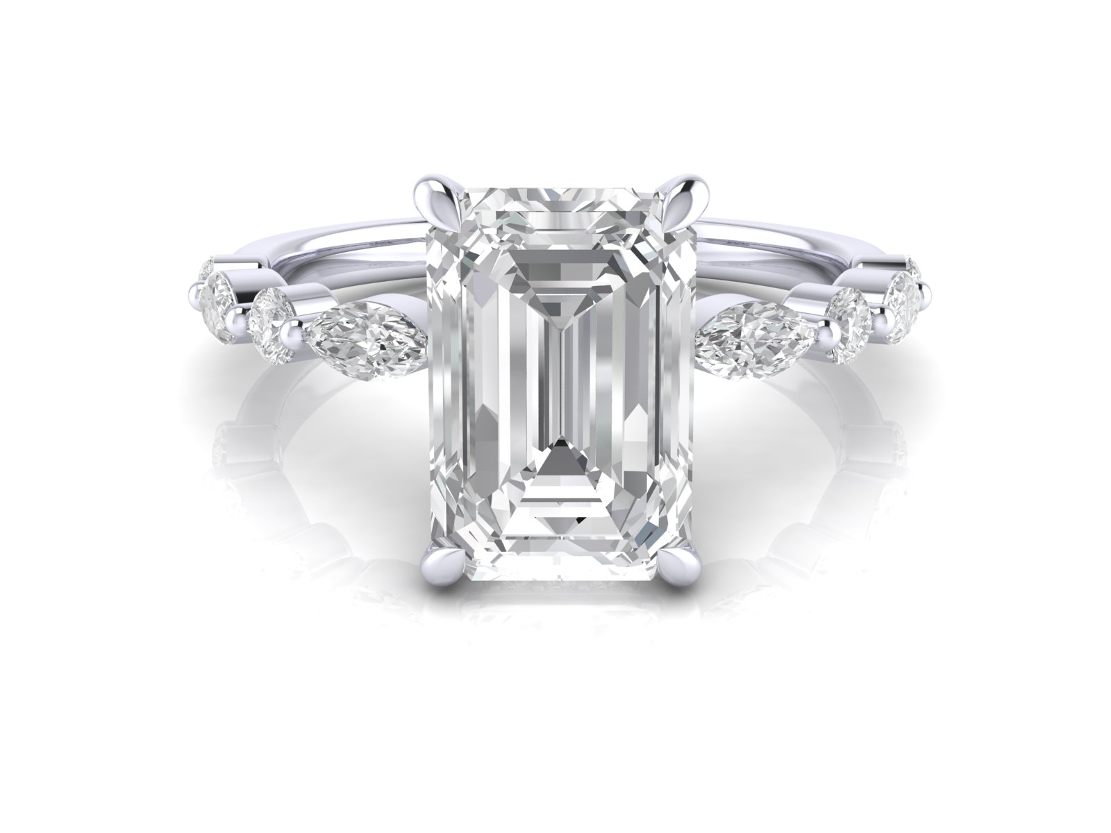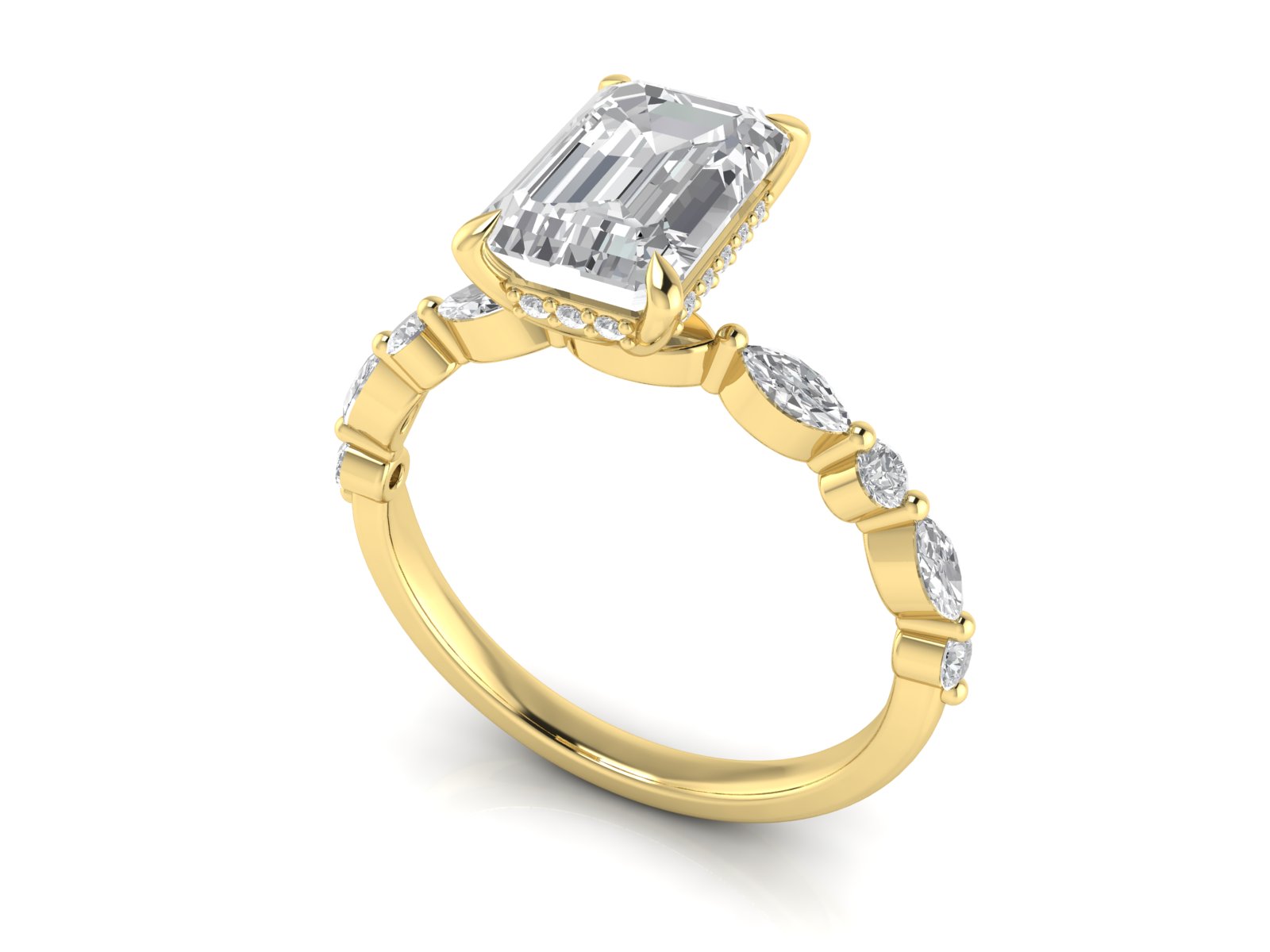 A modern twist on the classic solitaire, this design pairs an emerald-cut center stone with a marquise and round diamond band elegantly set together with single studs creating a delicate and dainty pattern along the band.