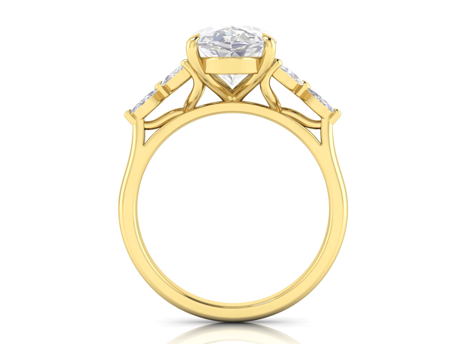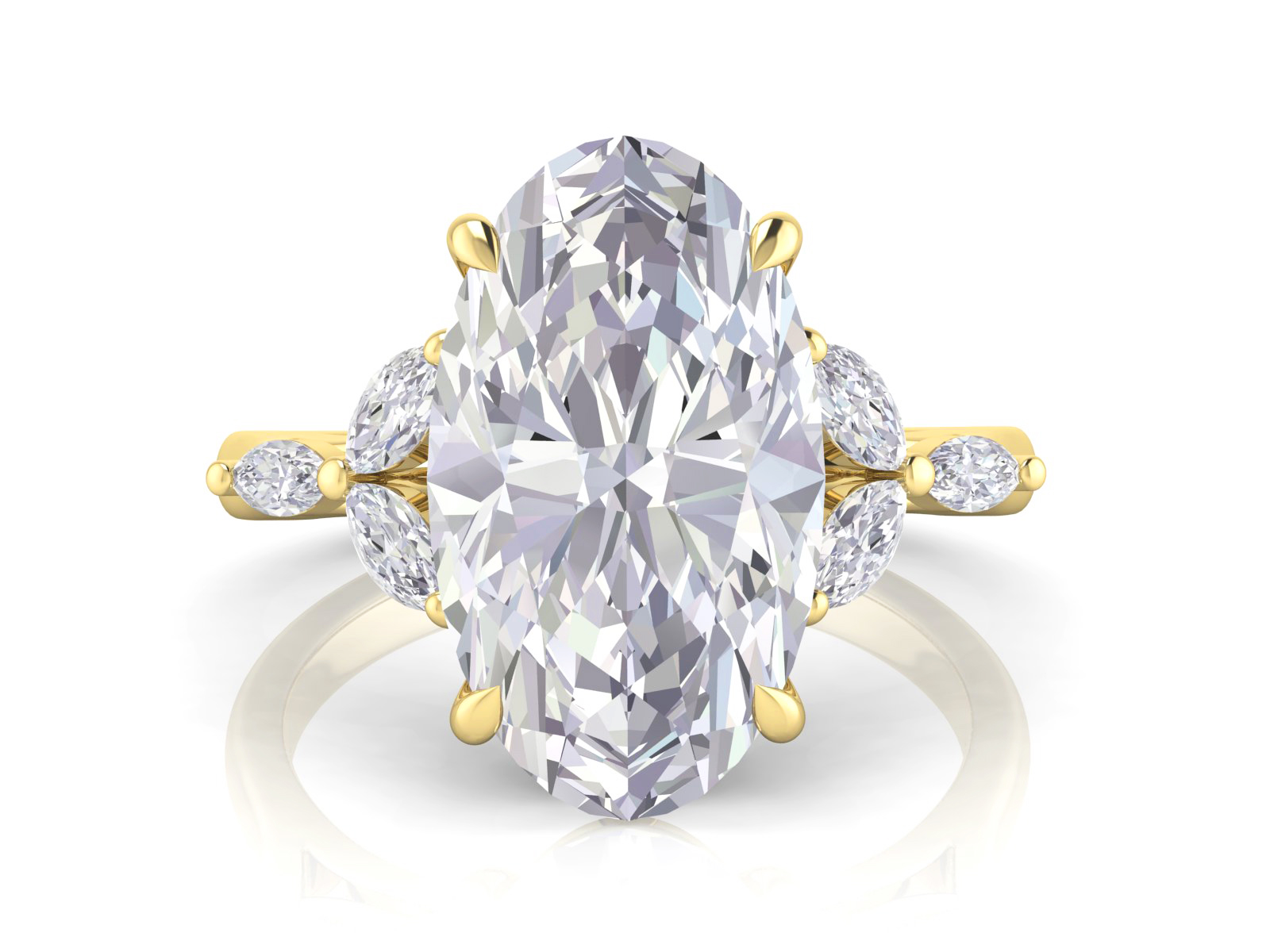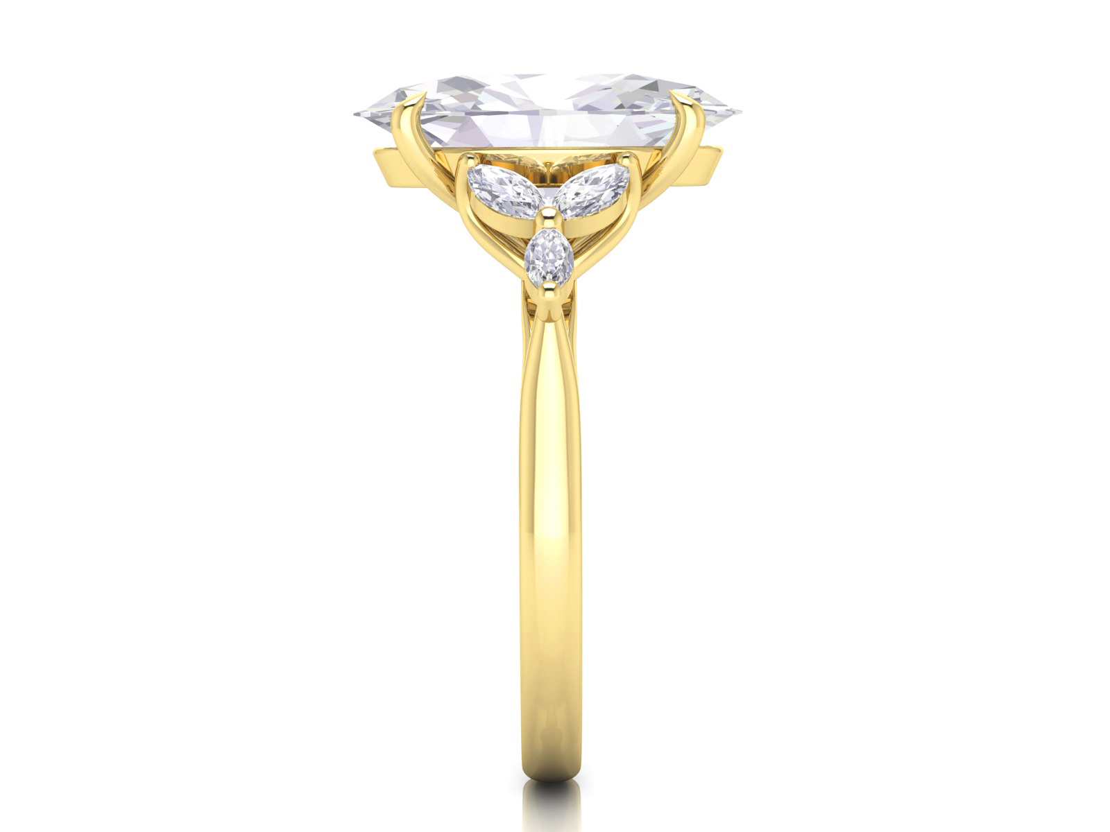 Description: Featuring an oval centre stone framed by clusters of marquise diamonds, this trilogy design offers a floral-inspired look with exceptional sparkle. The clustered side stones create a bold yet refined aesthetic perfect for those who love unique detailing.