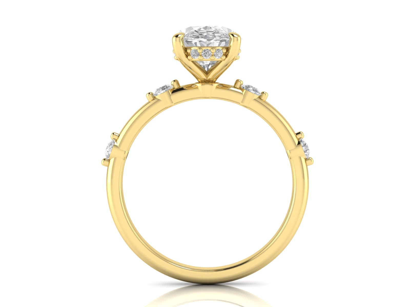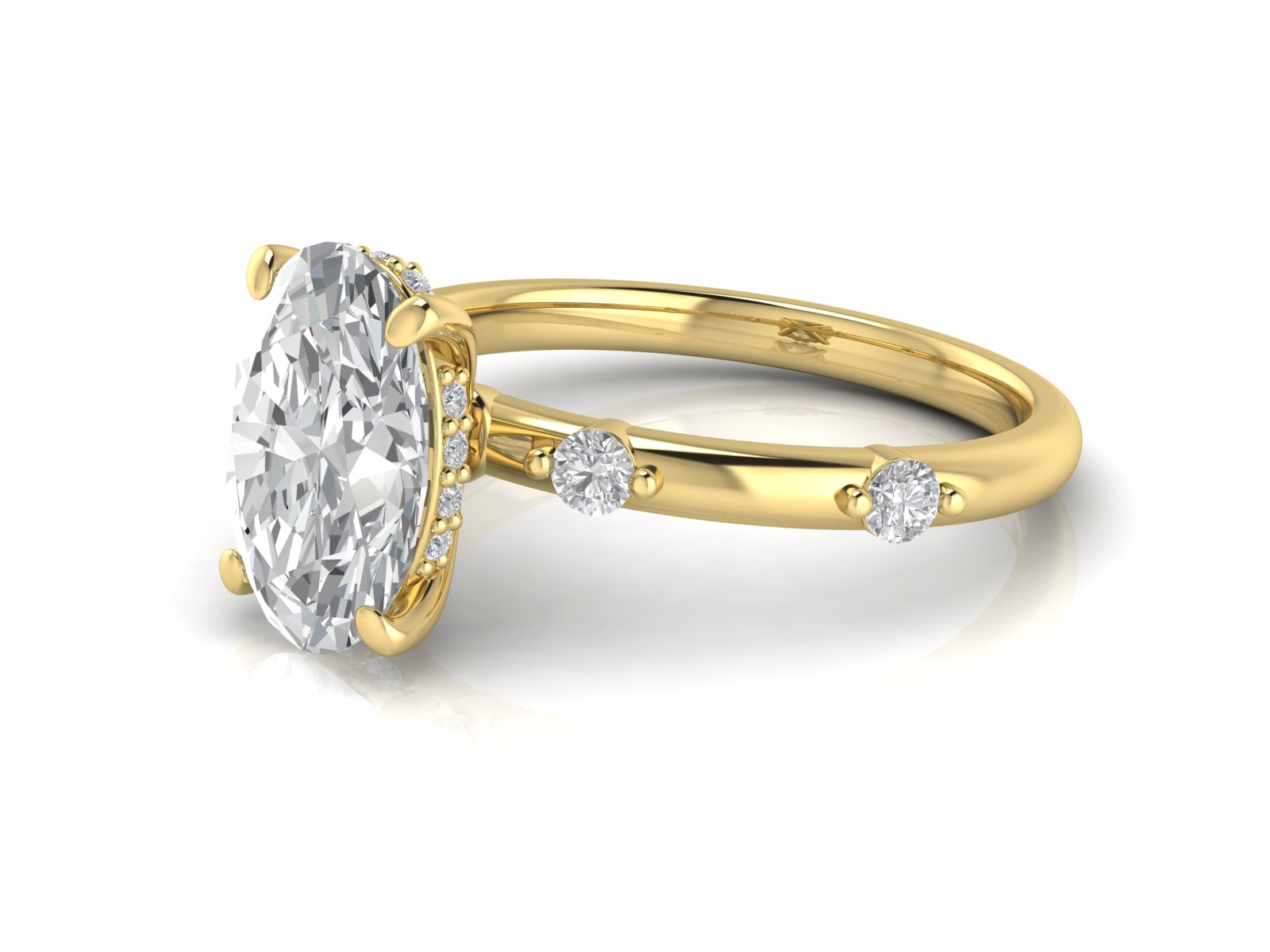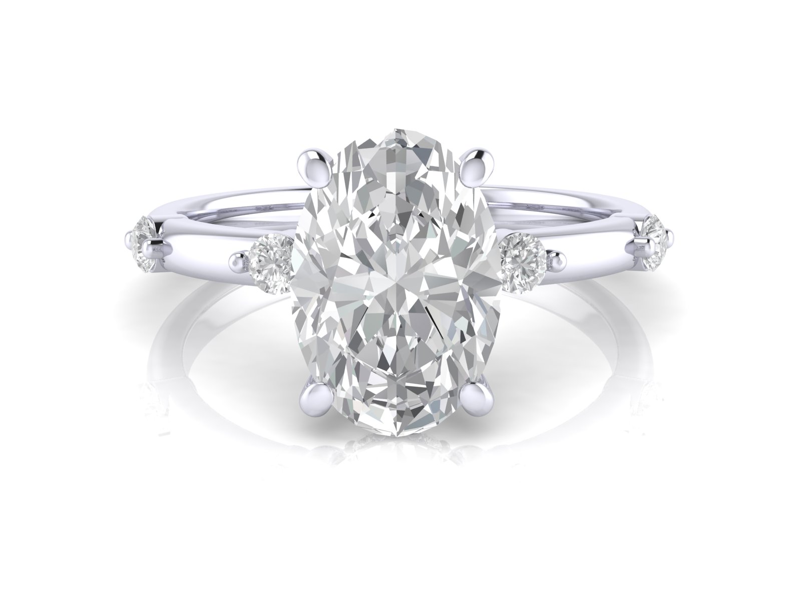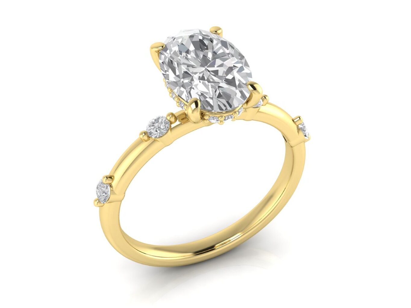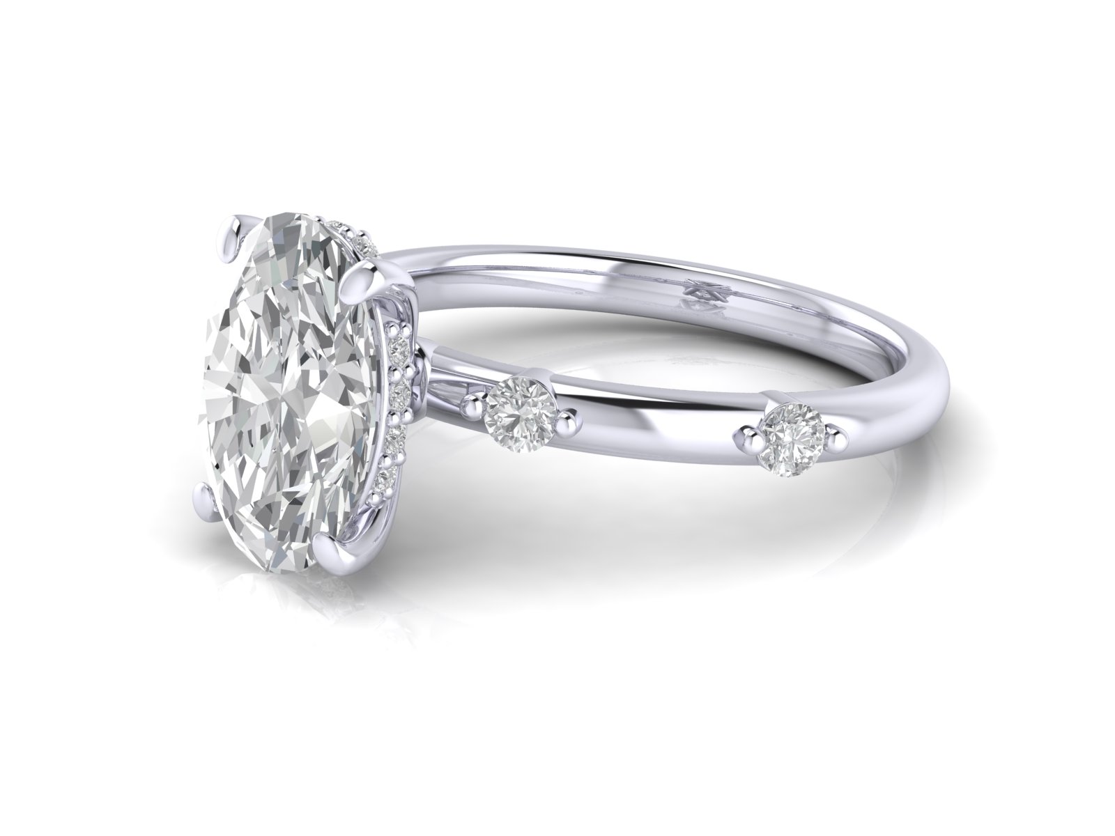 A timeless oval centre stone paired with a spaced diamond (or “station”) band. This creates a delicate, airy look with diamonds elegantly punctuating the band.