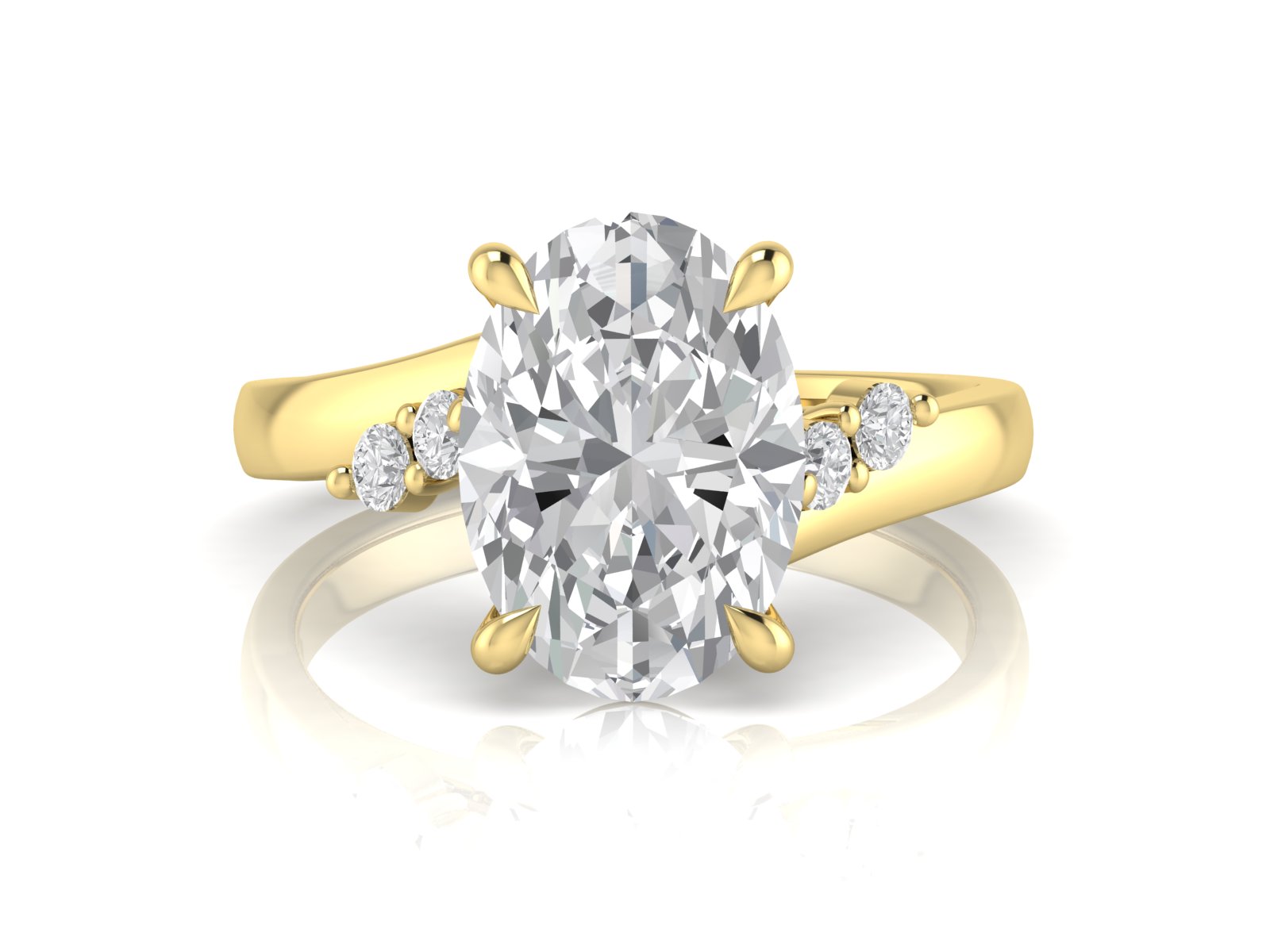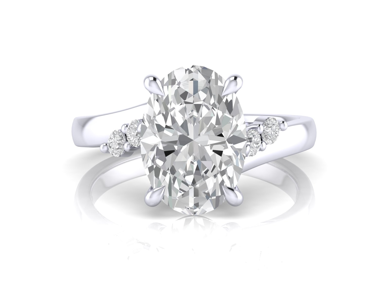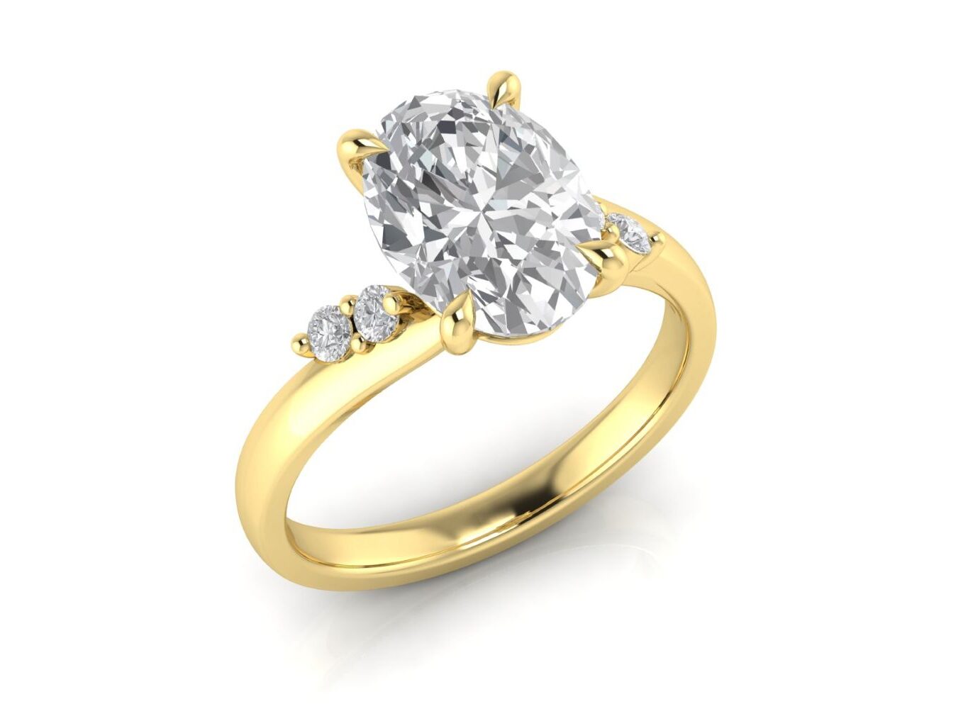 An oval centre stone is paired with round diamond clusters, creating a multi-stone look with added dimension and visual impact. This trilogy style stands out for its distinctive clustered silhouette and striking presence.