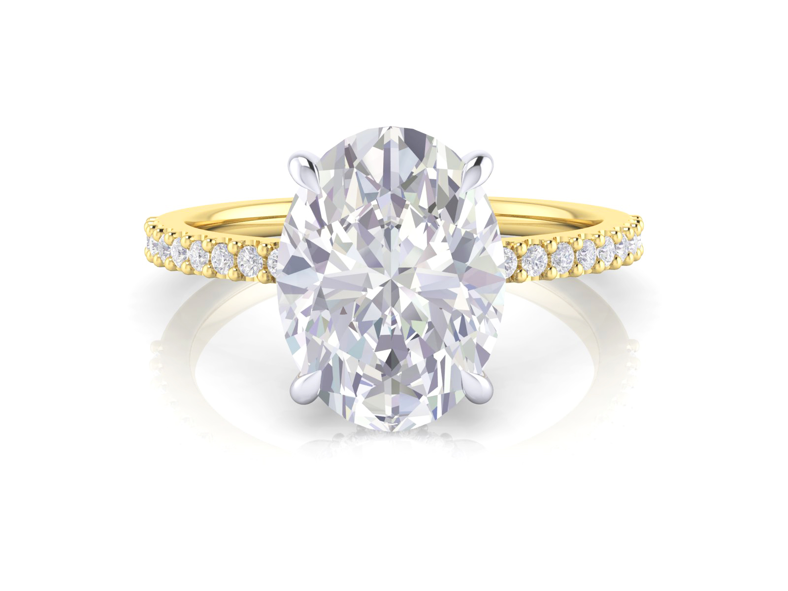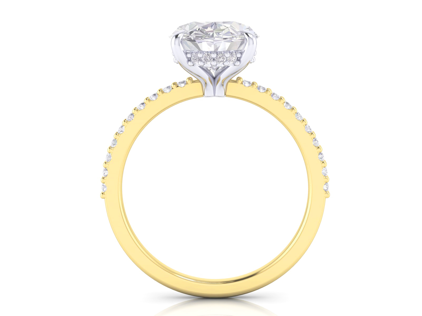 A oval -cut centre diamond paired with a shimmering diamond band for maximum brilliance. A hidden halo sits beneath the centre stone, adding extra sparkle from every angle while maintaining a clean, classic silhouette from the top view.
