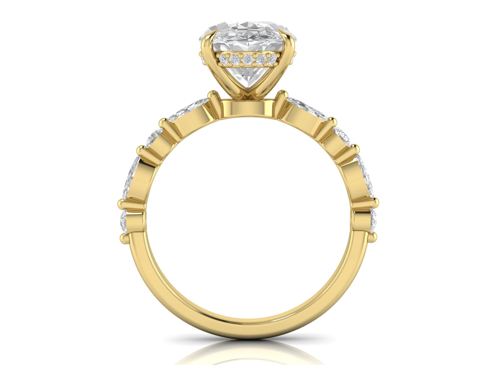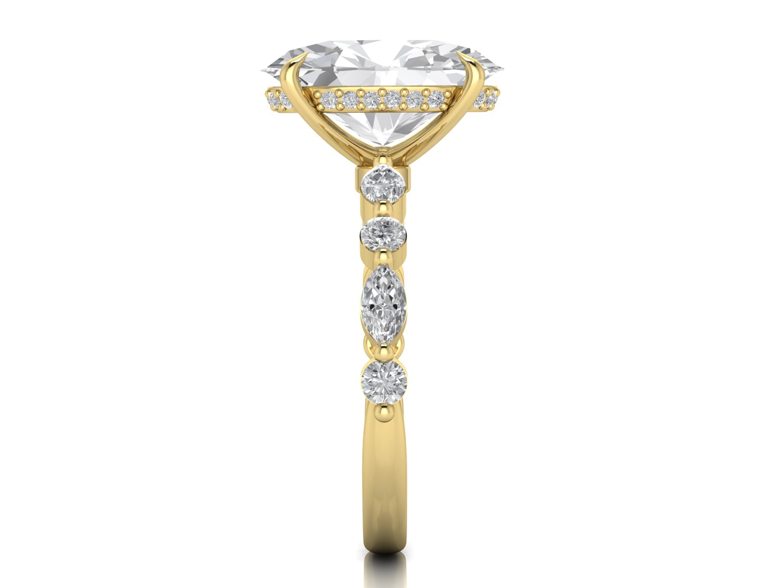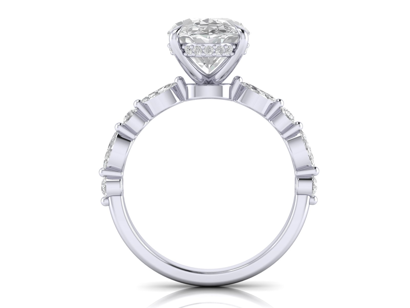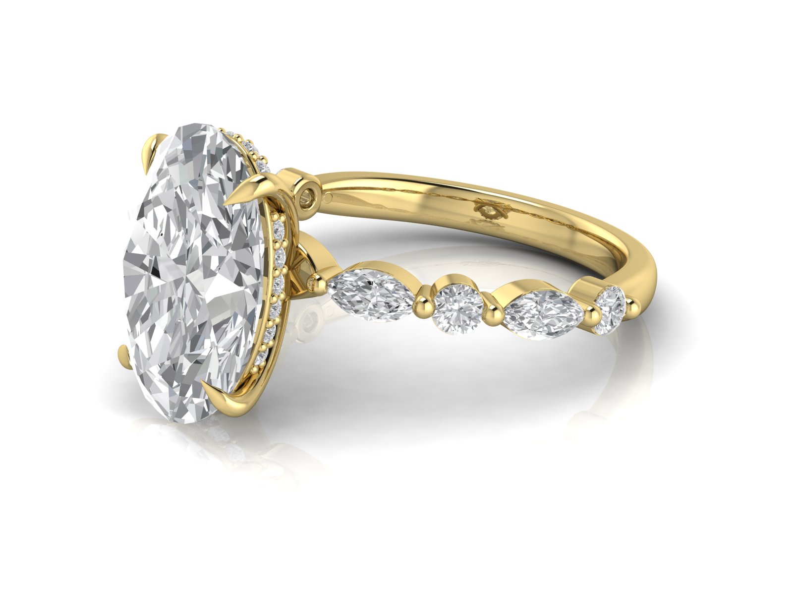 A modern twist on the classic solitaire, this design pairs an emerald-cut centre stone with a marquise and round diamond band elegantly set together with single studs. Delicate and dainty pattern along the band.