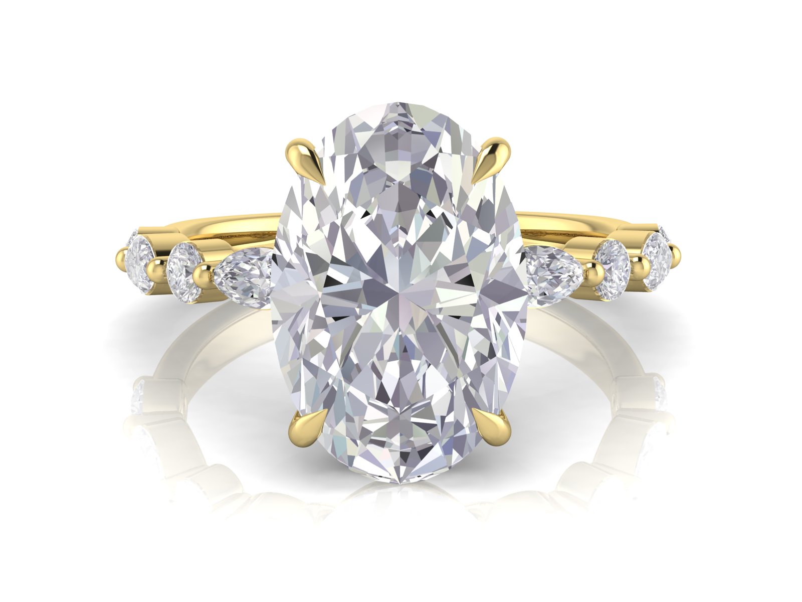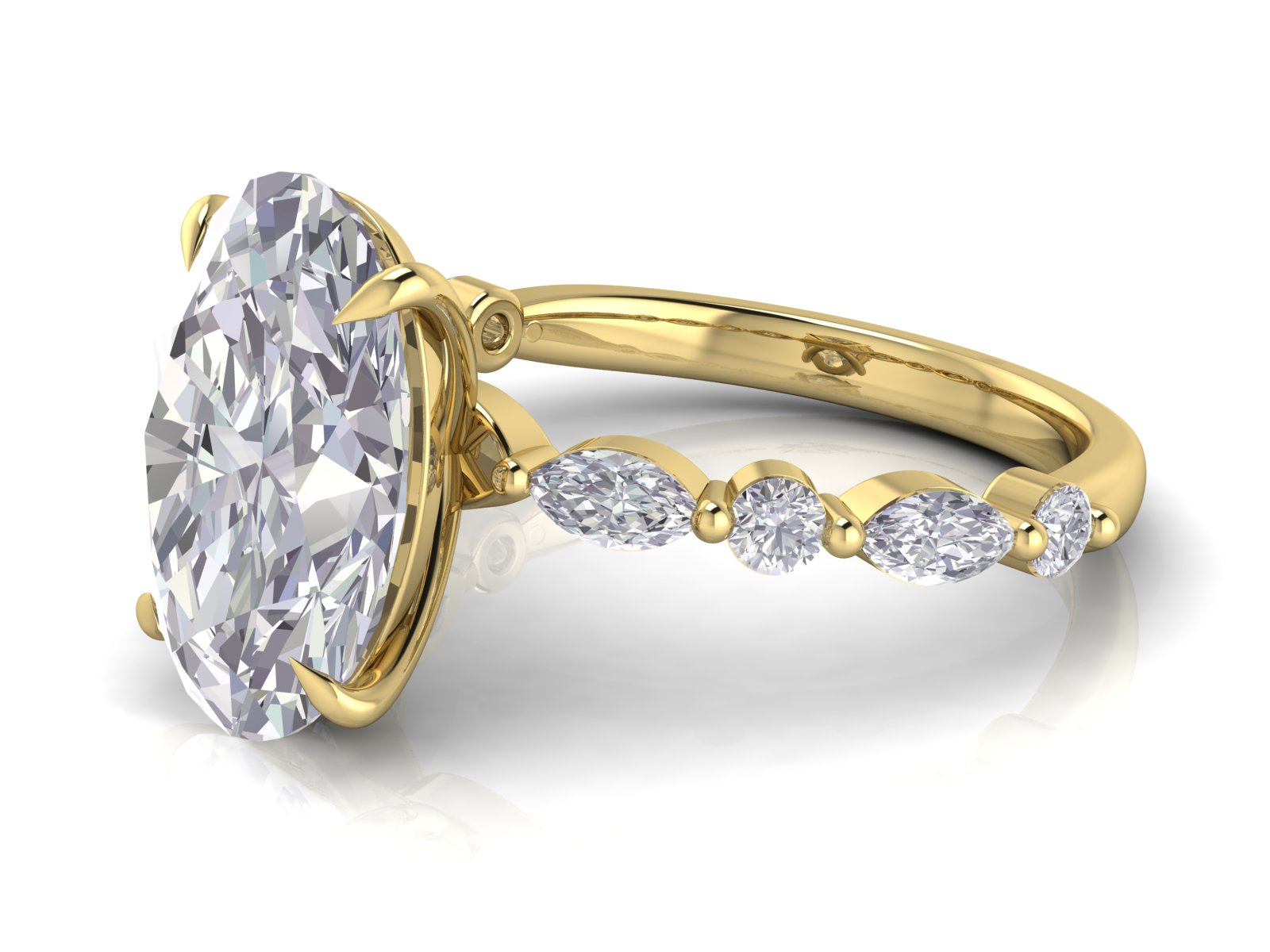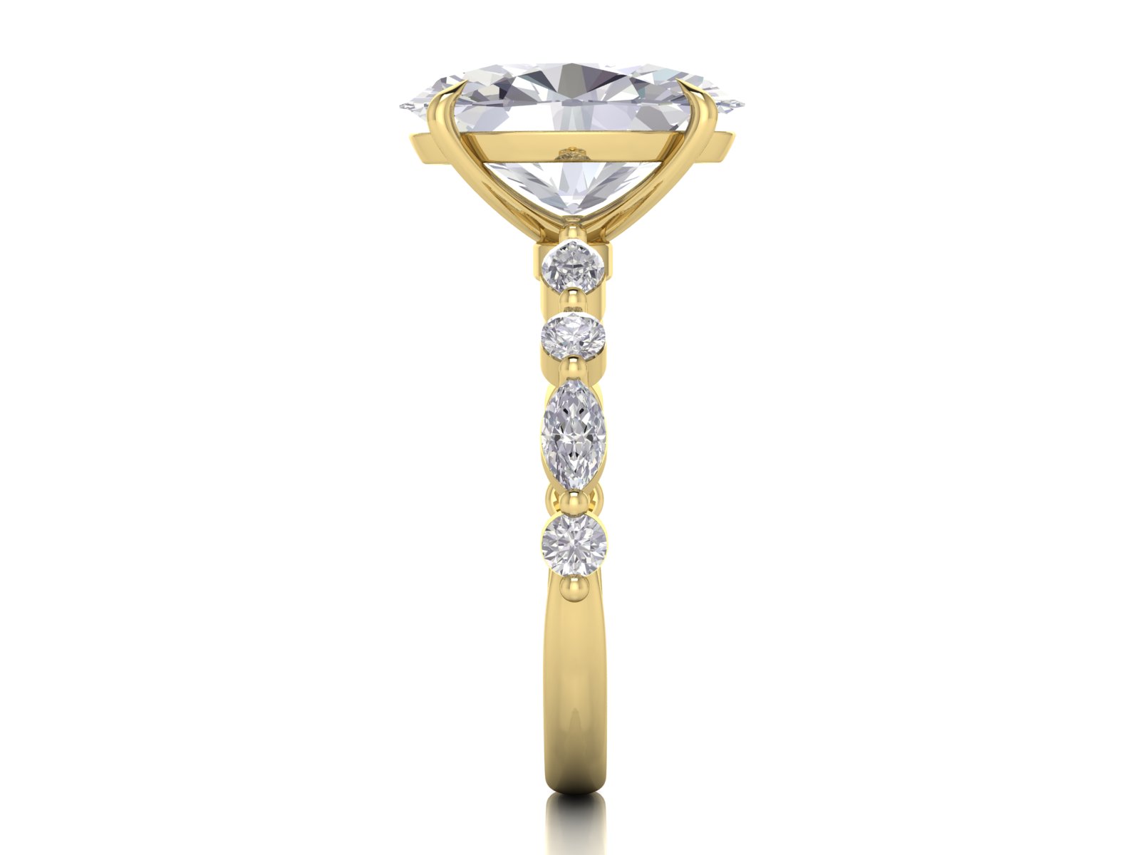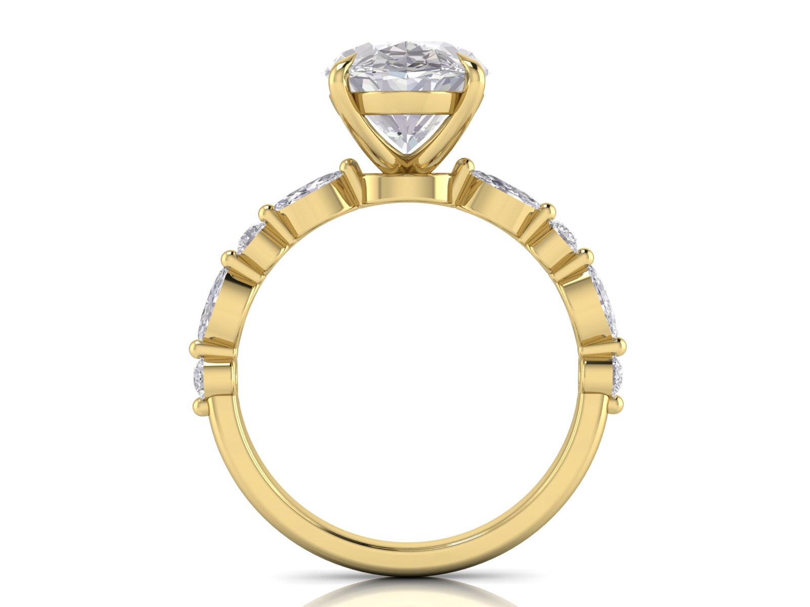 Description: A modern twist on the classic solitaire, this design pairs an emerald-cut centre stone with a marquise and round diamond band elegantly set together with single studs. Delicate and dainty pattern along the band.