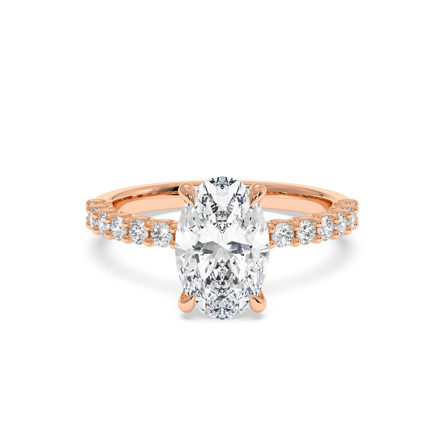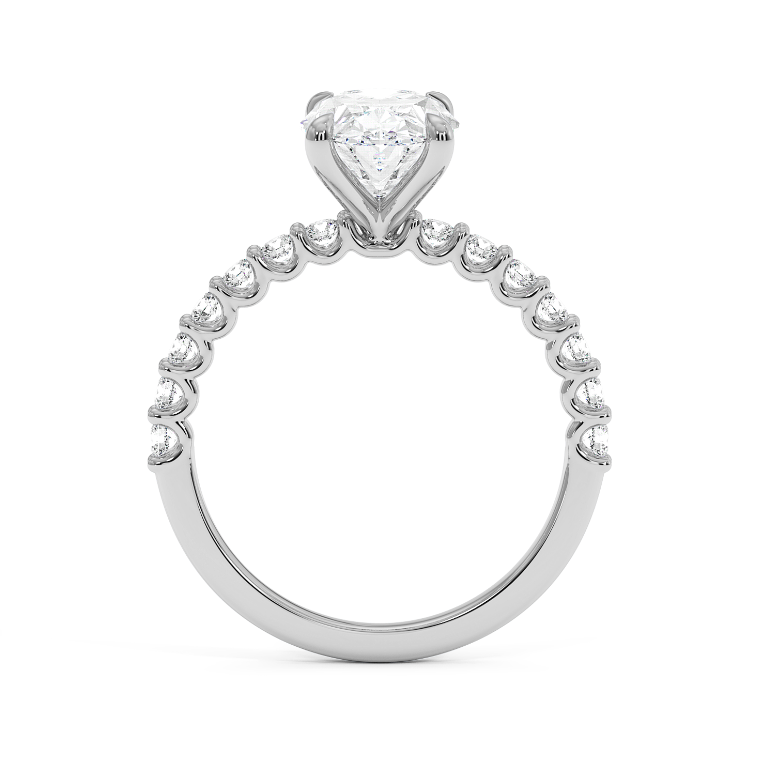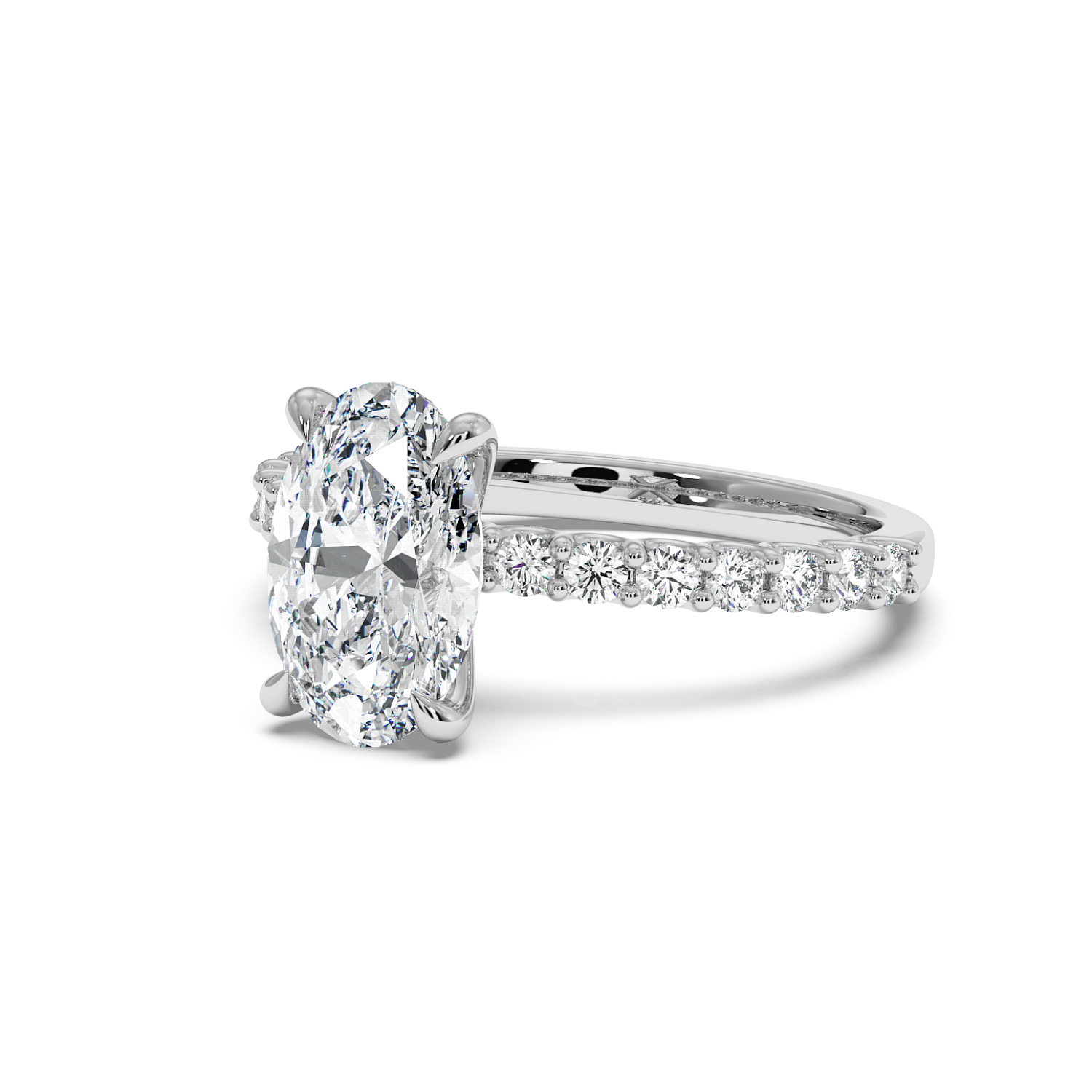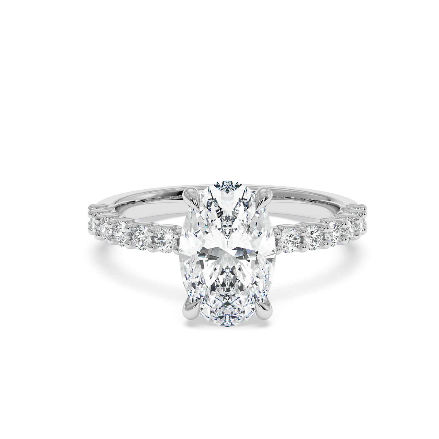 The oval centre stone is complemented by a scallop-set diamond band, designed to maximise light exposure and maximise diamond size on the band. A timeless choice with a refined finish.