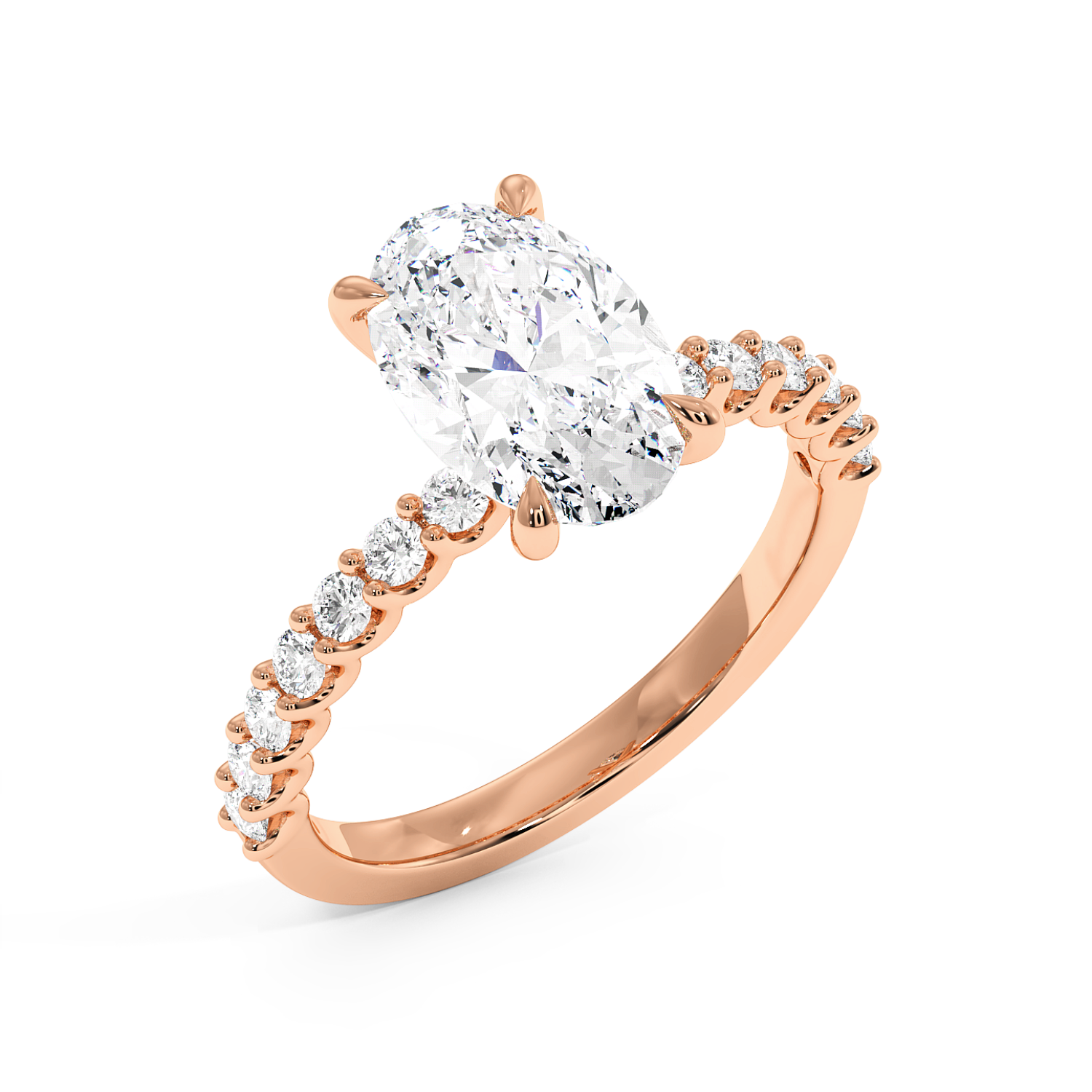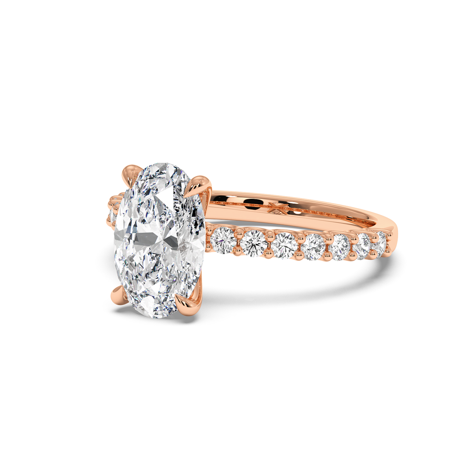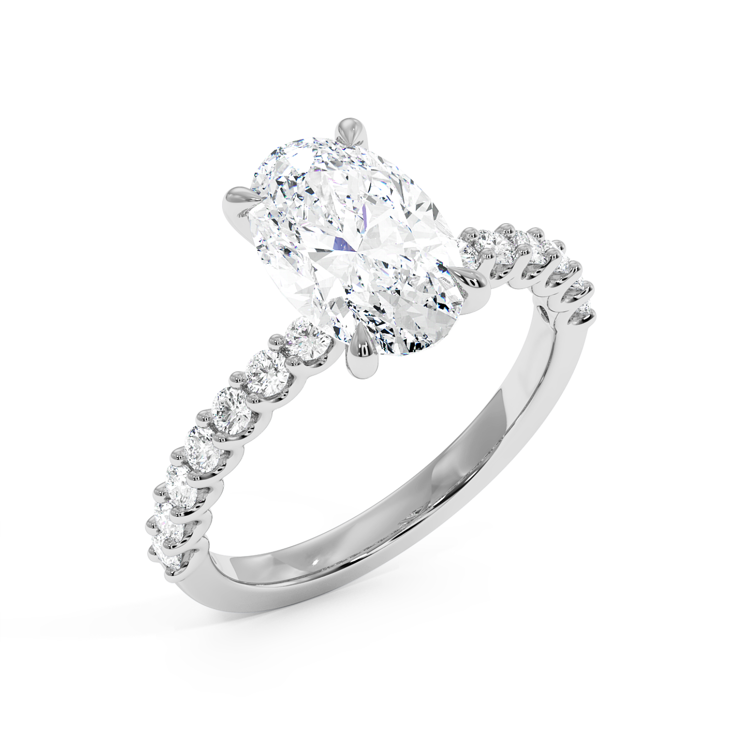 The oval centre stone is complemented by a scallop-set diamond band, designed to maximise light exposure and maximise diamond size on the band. A timeless choice with a refined finish.