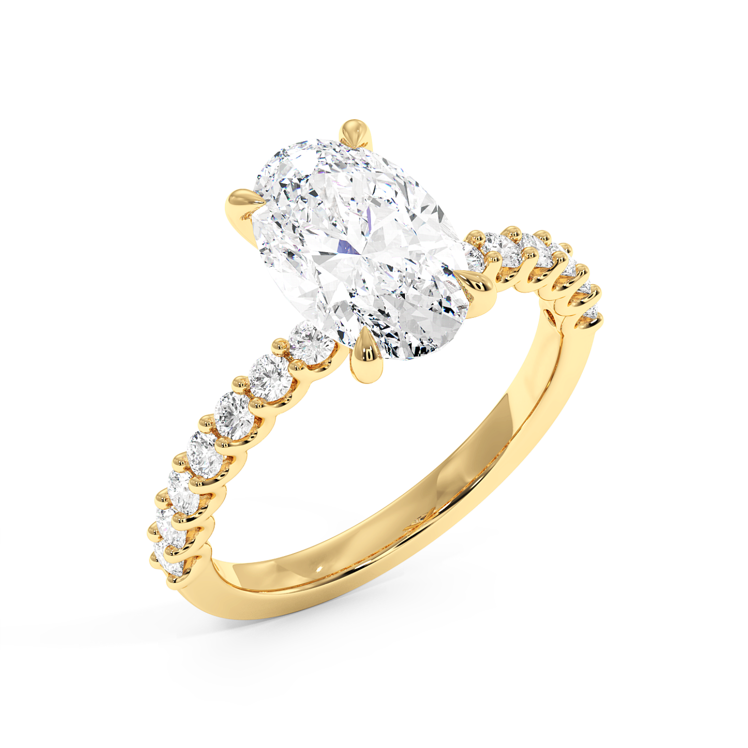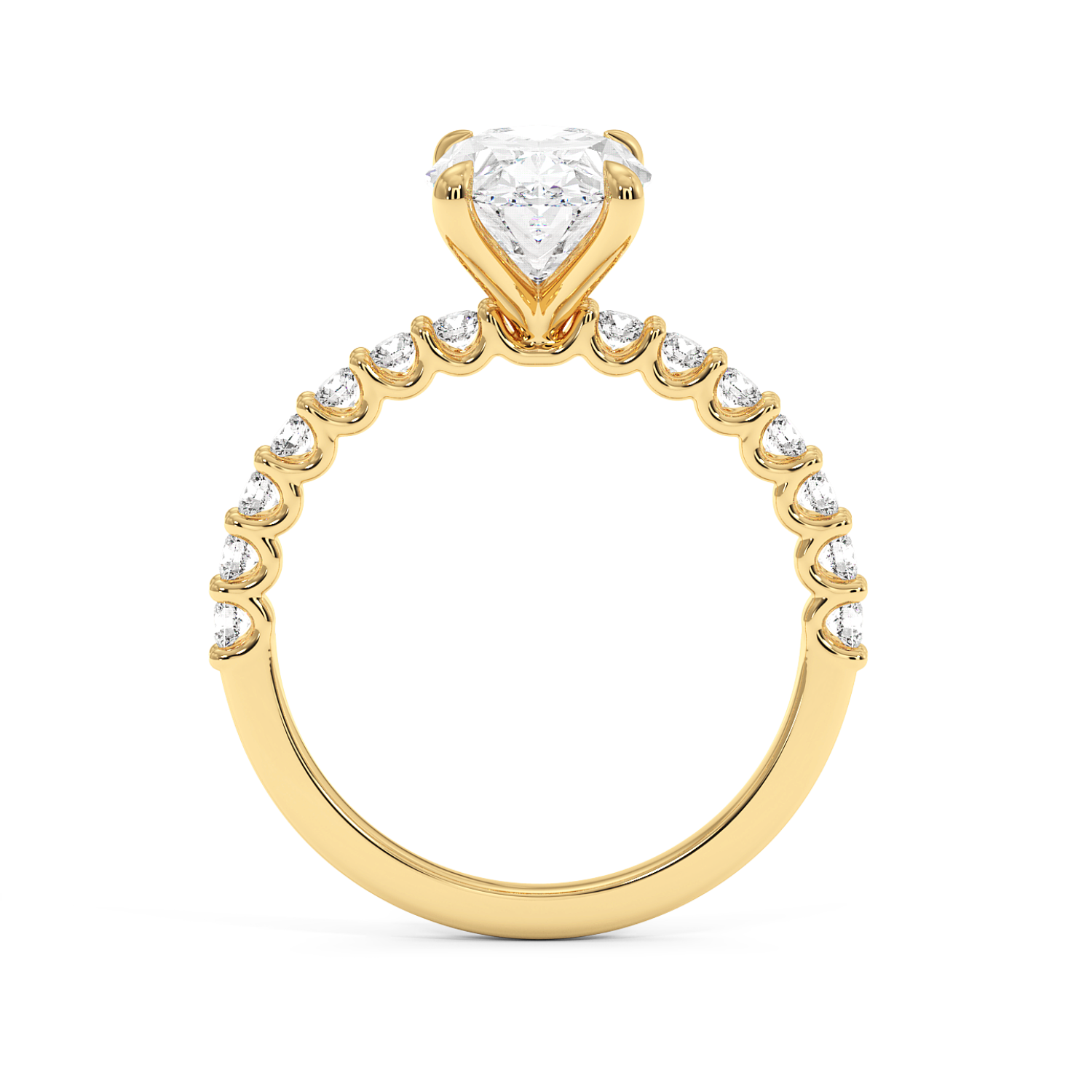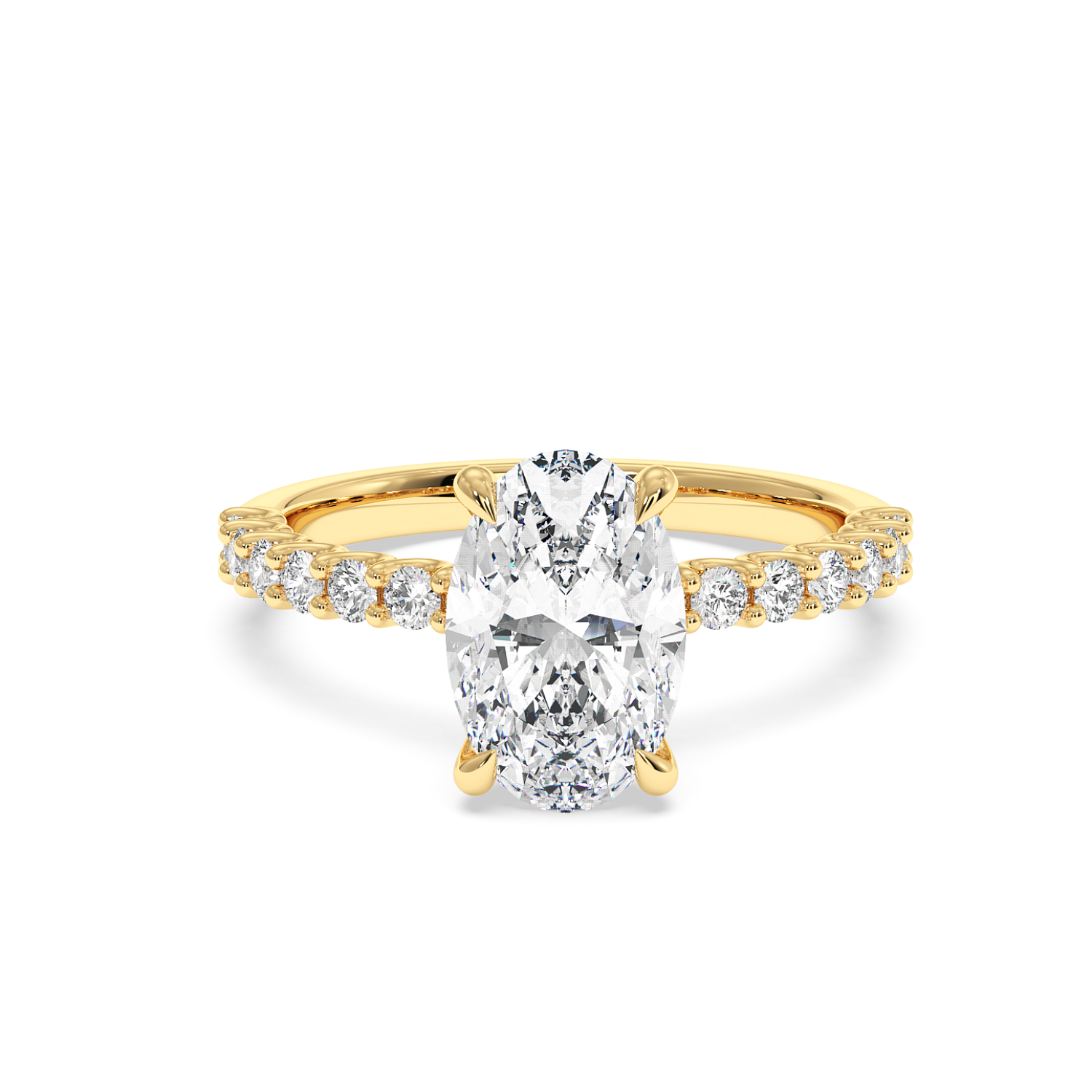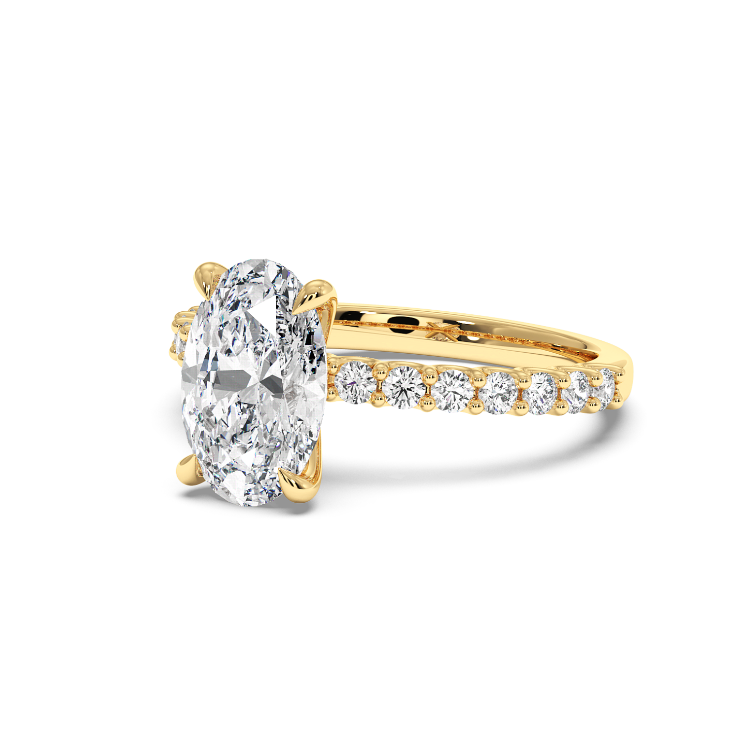 The oval centre stone is complemented by a scallop-set diamond band, designed to maximise light exposure and maximise diamond size on the band. A timeless choice with a refined finish.