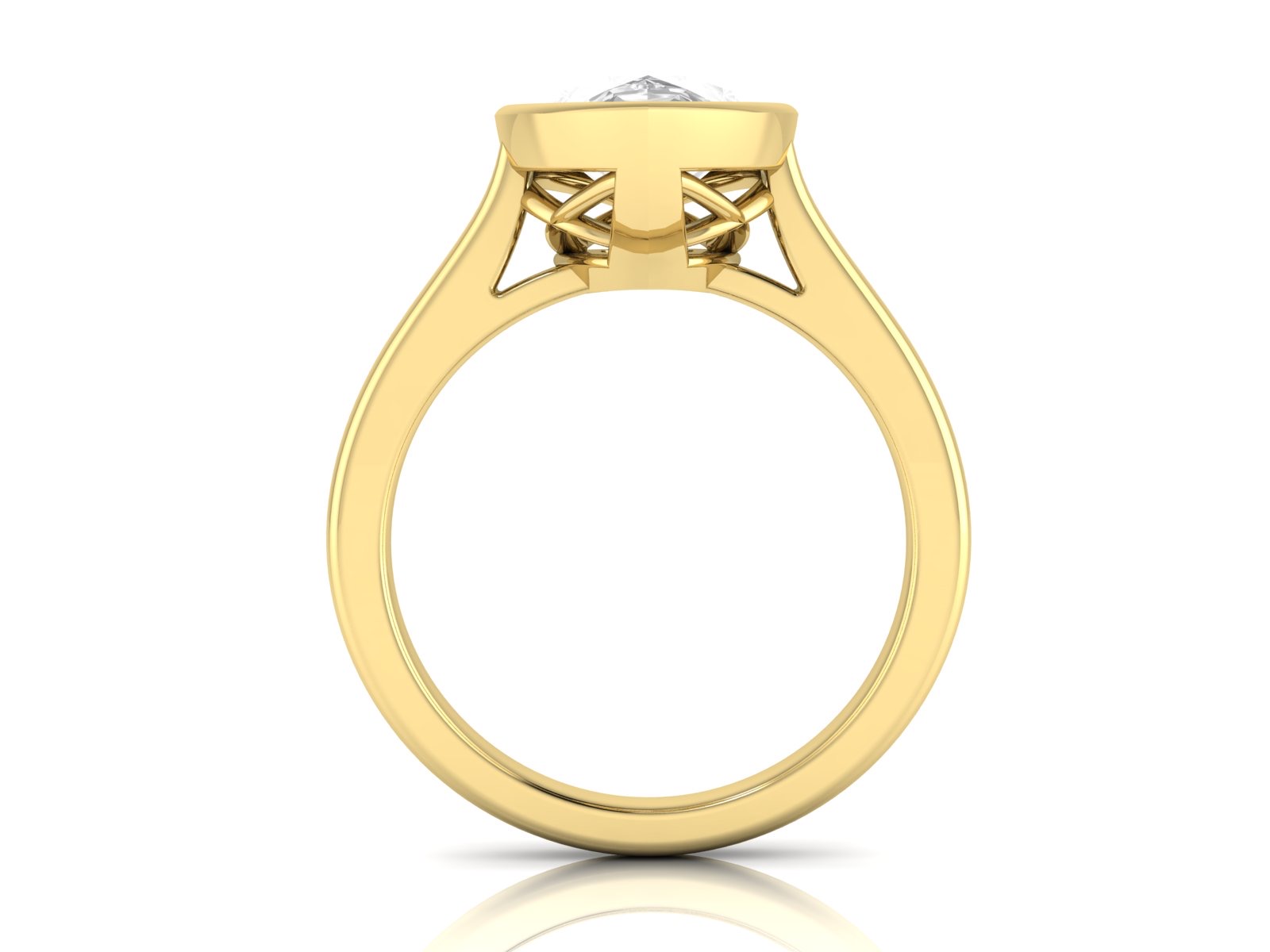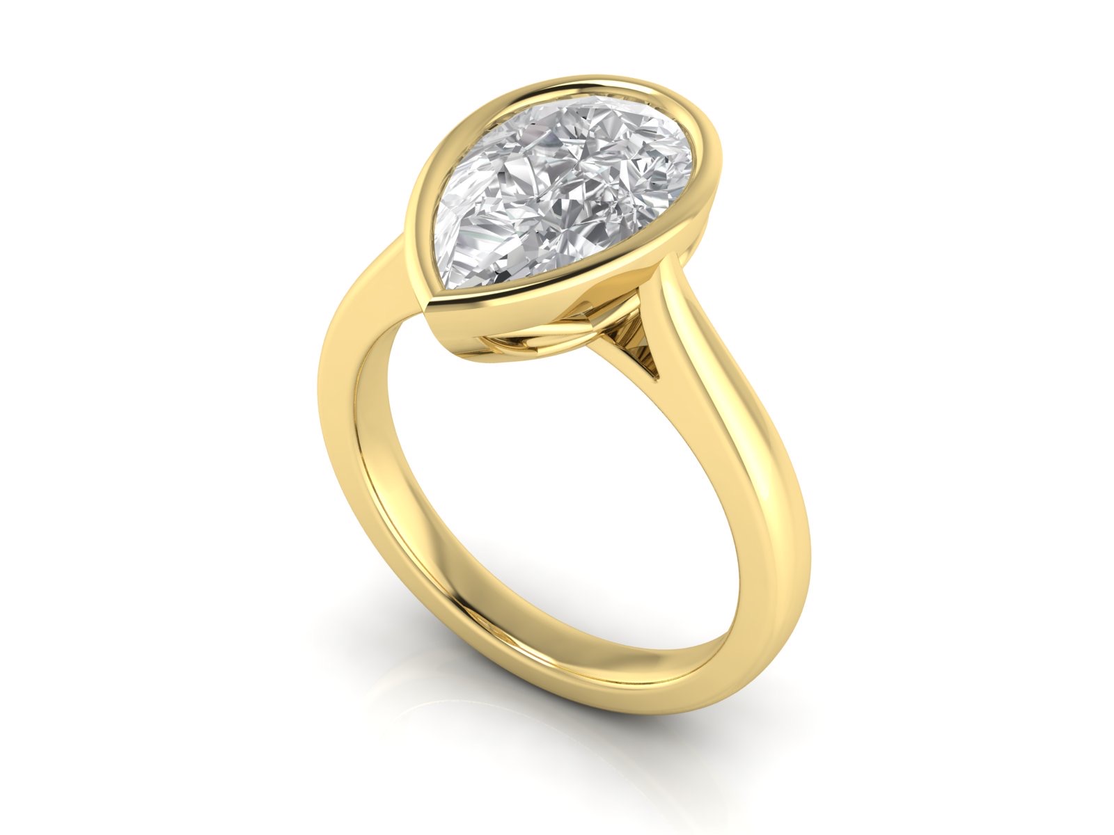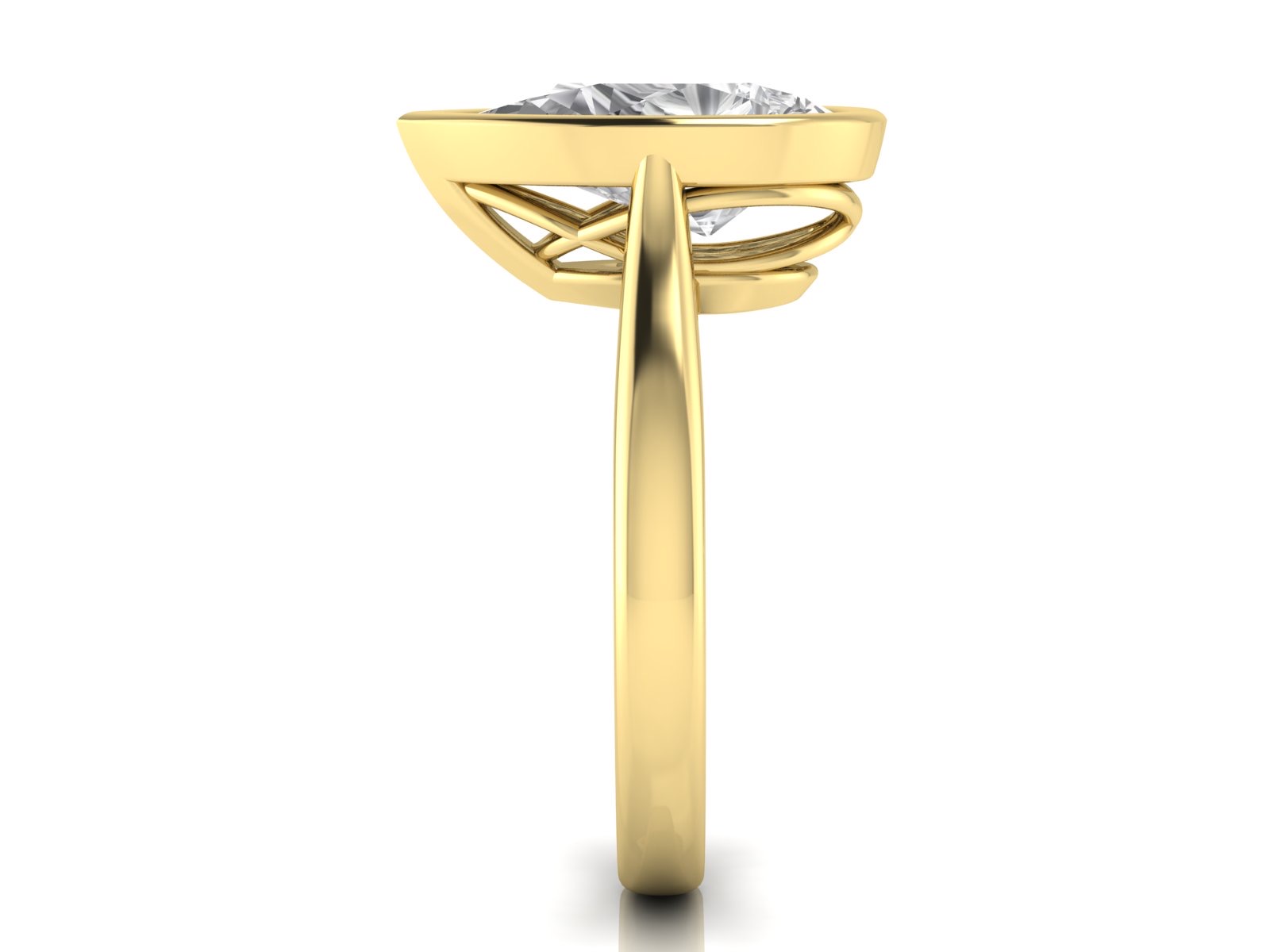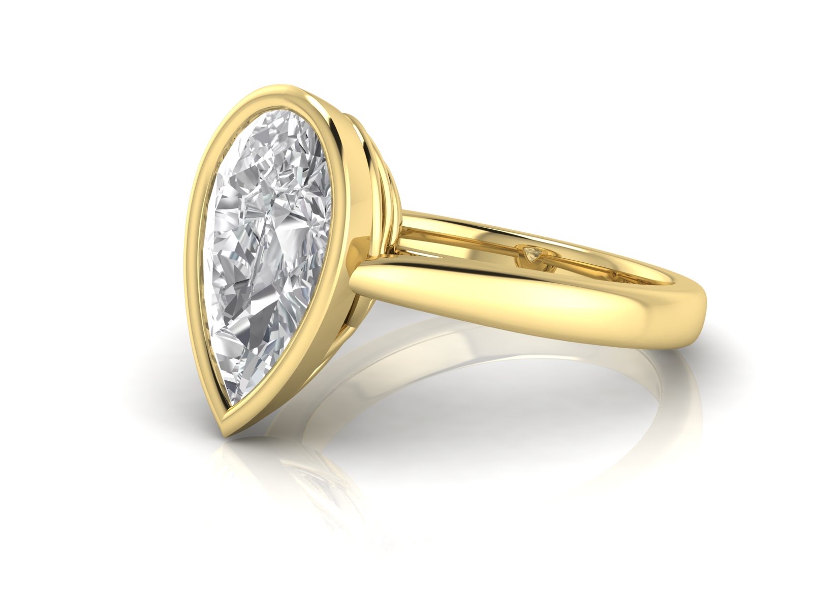 A sleek and contemporary pear-shaped diamond secured in a full bezel setting. The design features subtle structural detailing beneath the centre stone, offering added stability and visual interest. With its smooth, protective outline, this style is ideal for everyday wear while maintaining clean, modern simplicity.