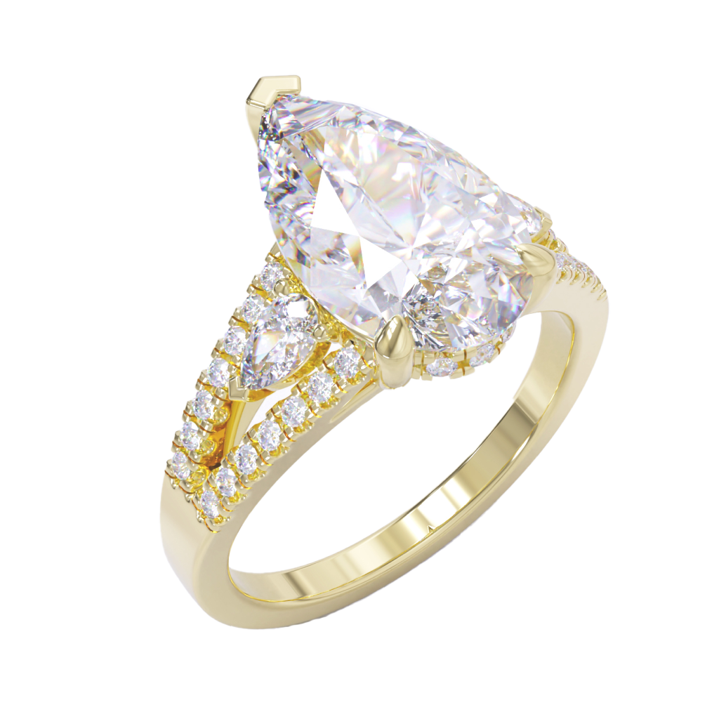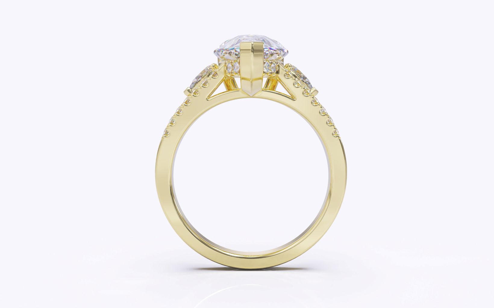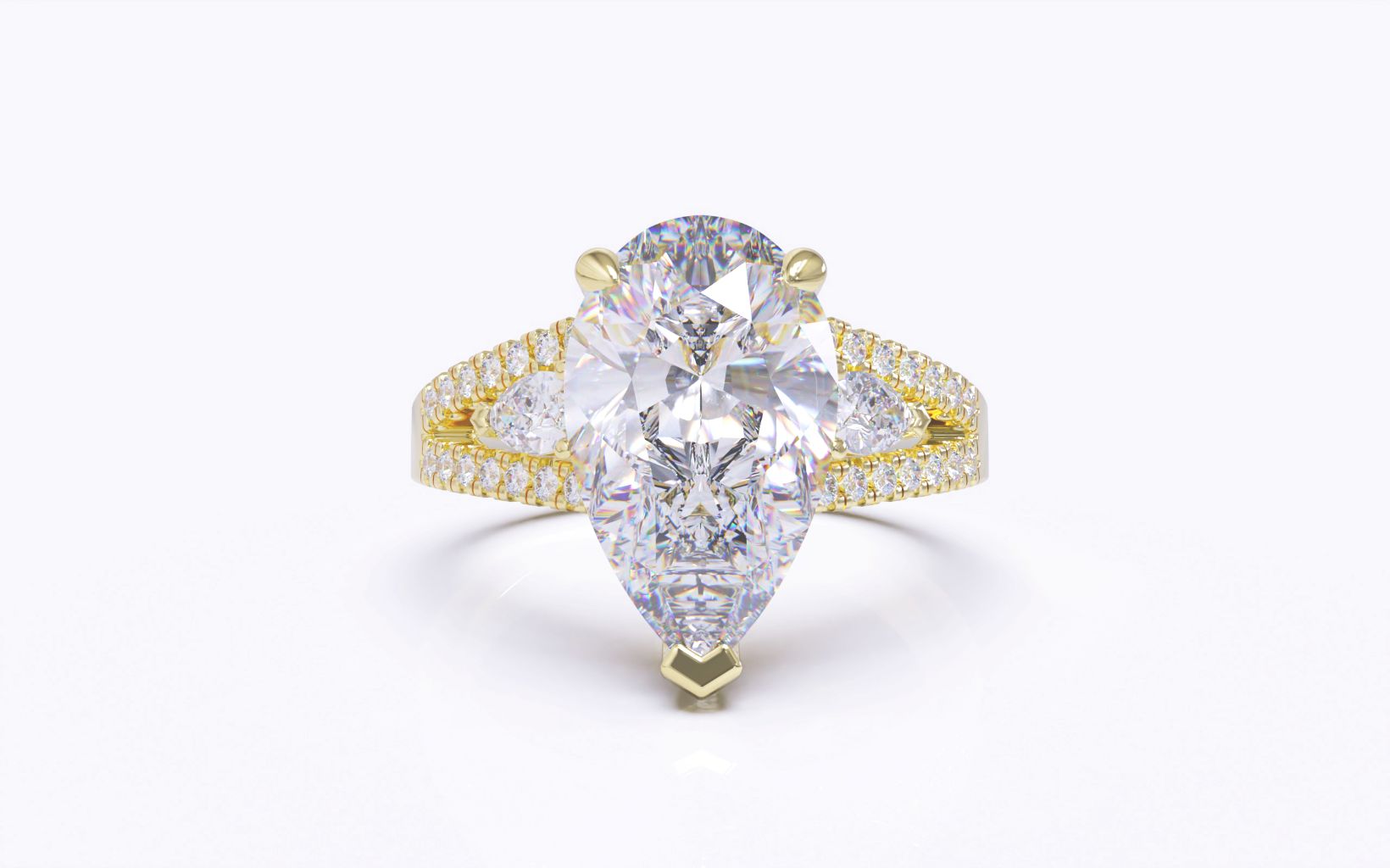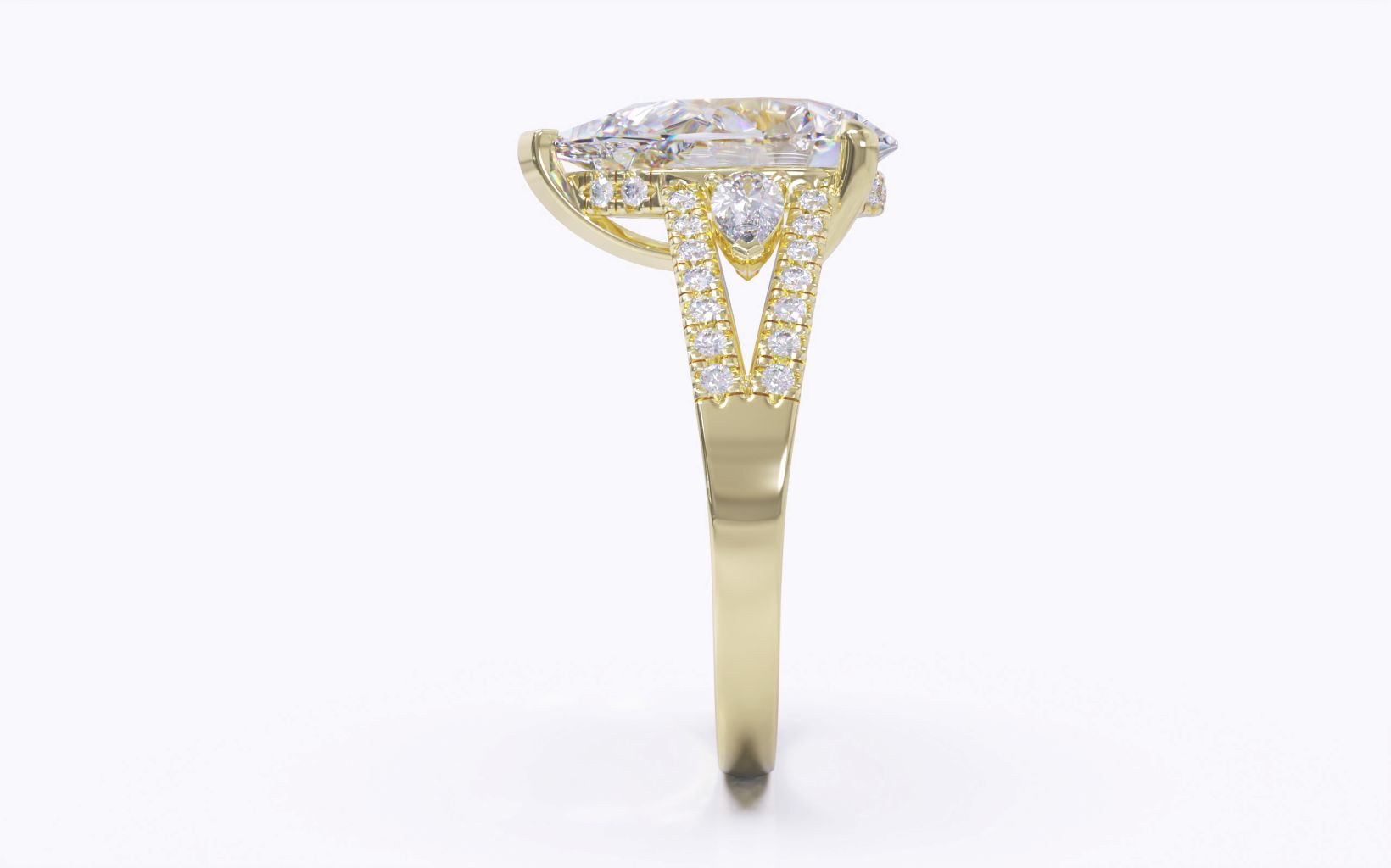 Description: A contemporary take on the trilogy ring, this design features a pear-shaped centre stone supported by two side stones, symbolising your past, present and future. The split diamond band adds drama and dimension, creating a beautifully balanced and eye-catching profile.