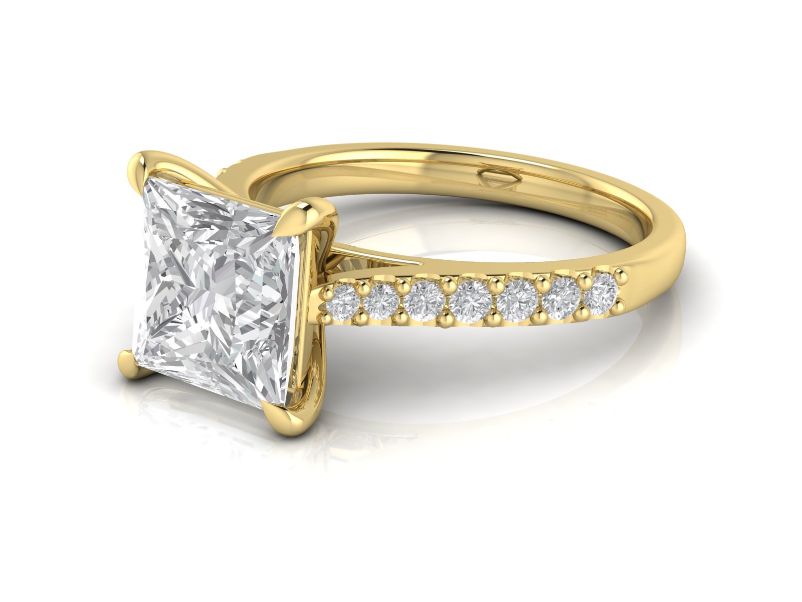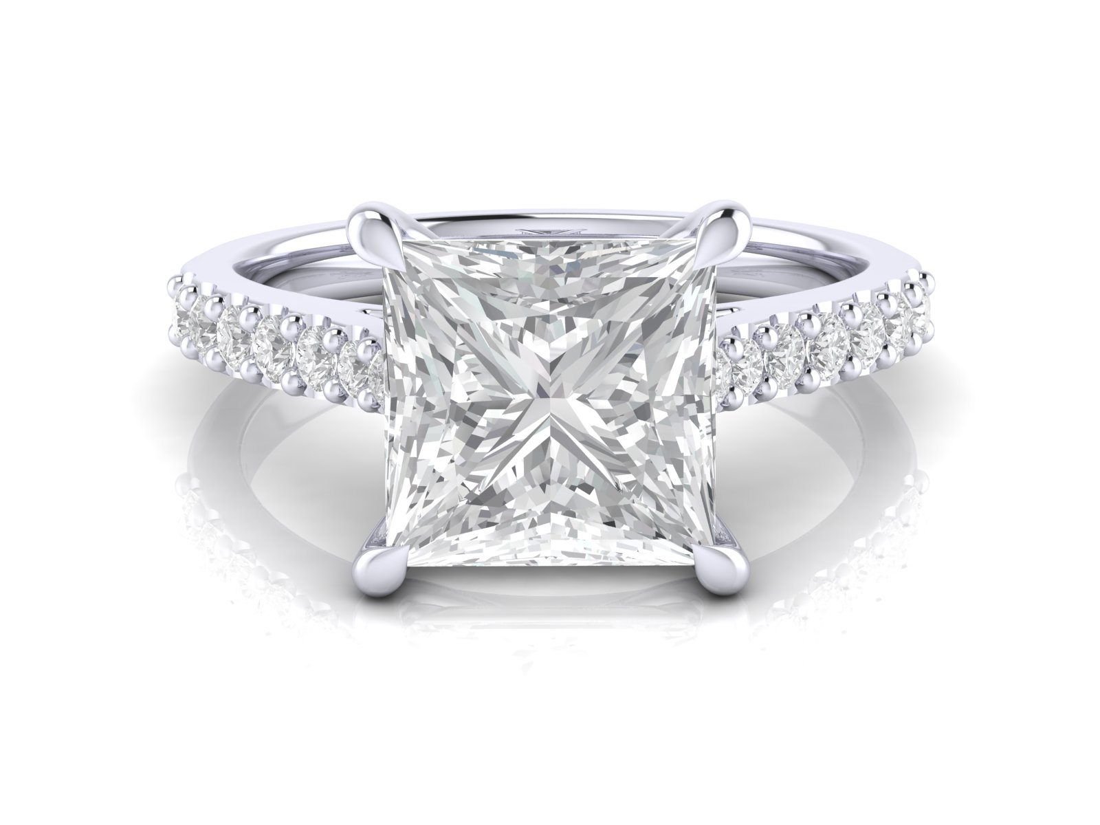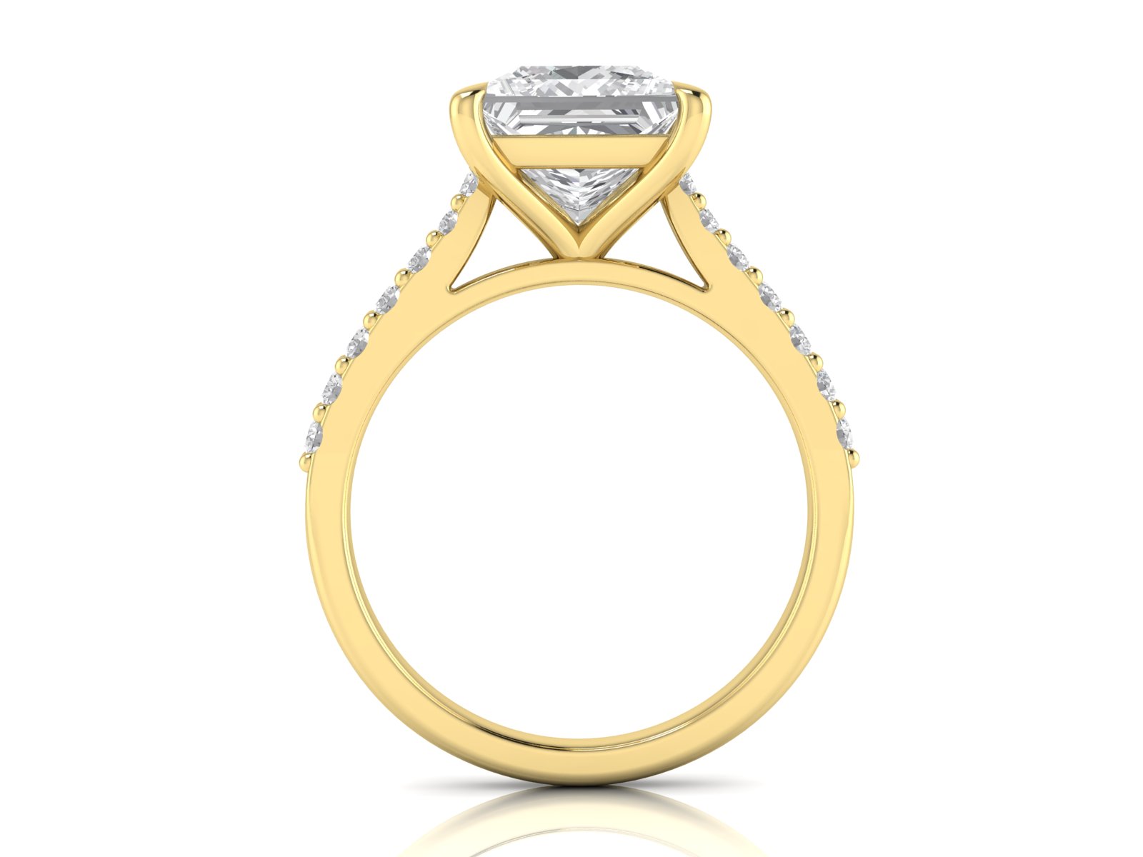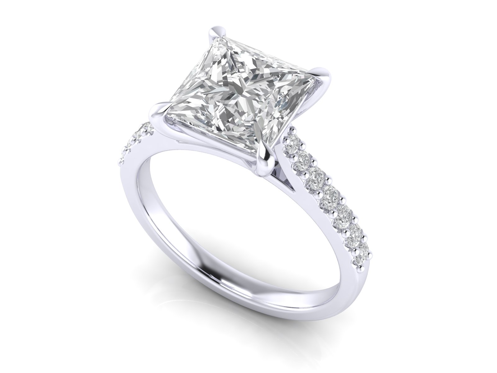 A princess cut centre stone elevated in a cathedral setting for added height and elegance. The diamond-set band enhances the design with refined sparkle while maintaining a classic silhouette.