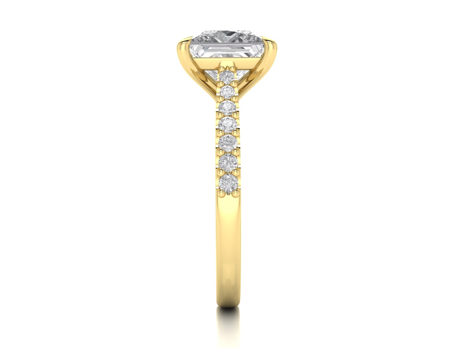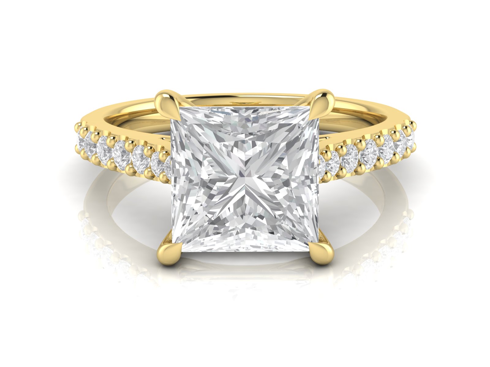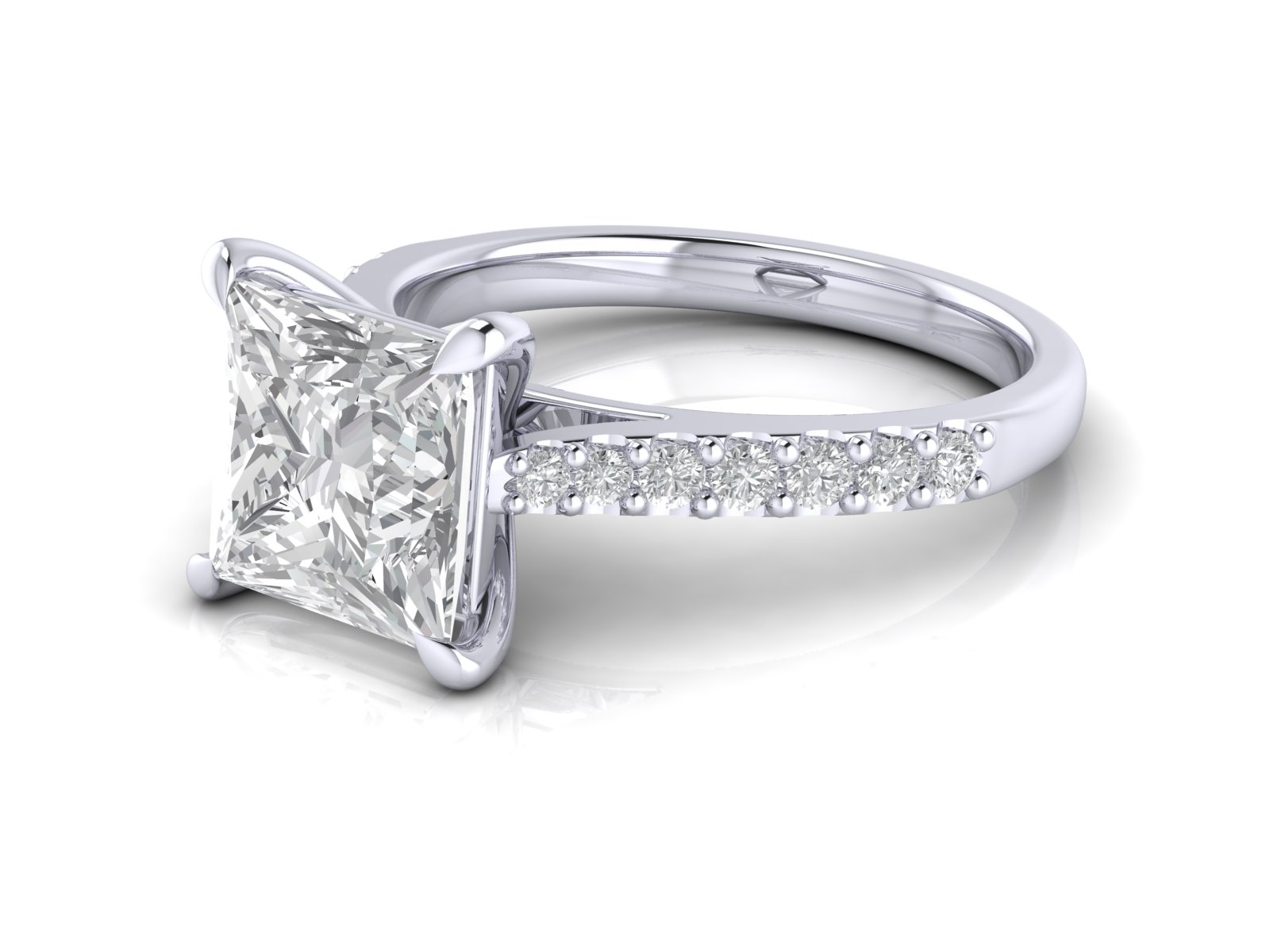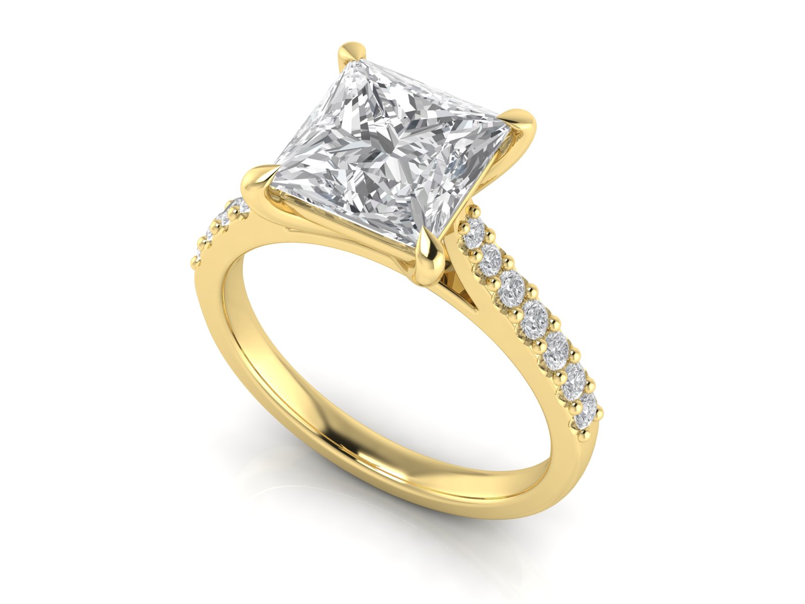 A princess cut centre stone elevated in a cathedral setting for added height and elegance. The diamond-set band enhances the design with refined sparkle while maintaining a classic silhouette.