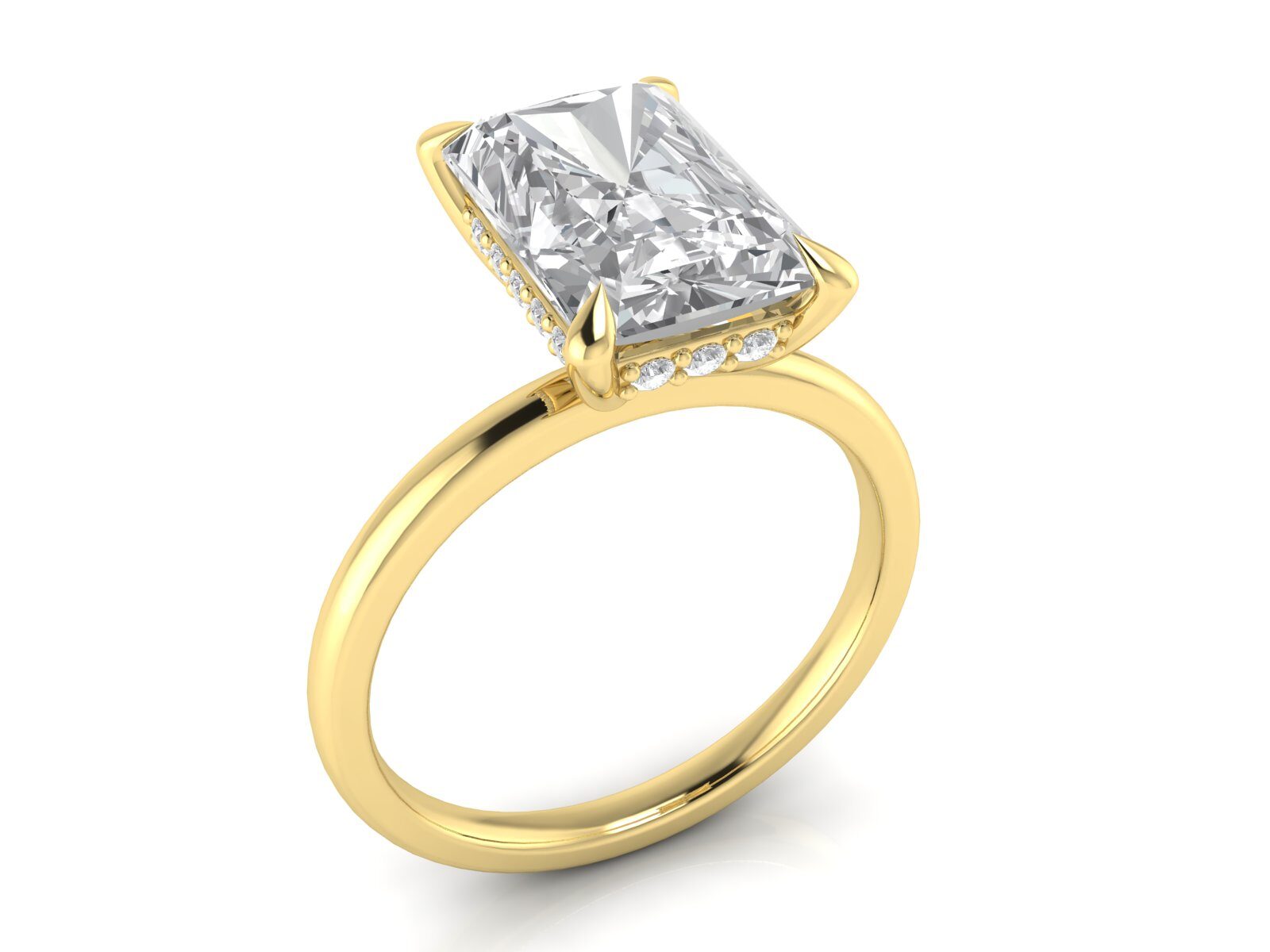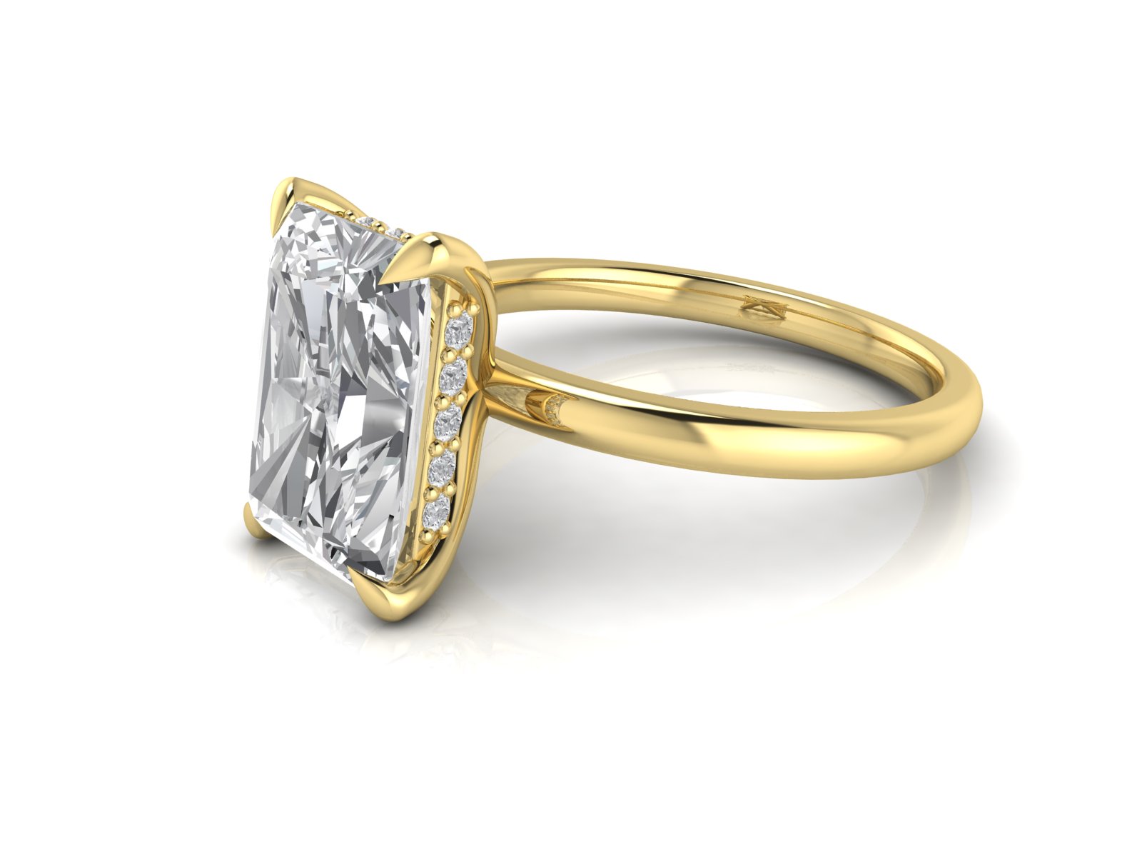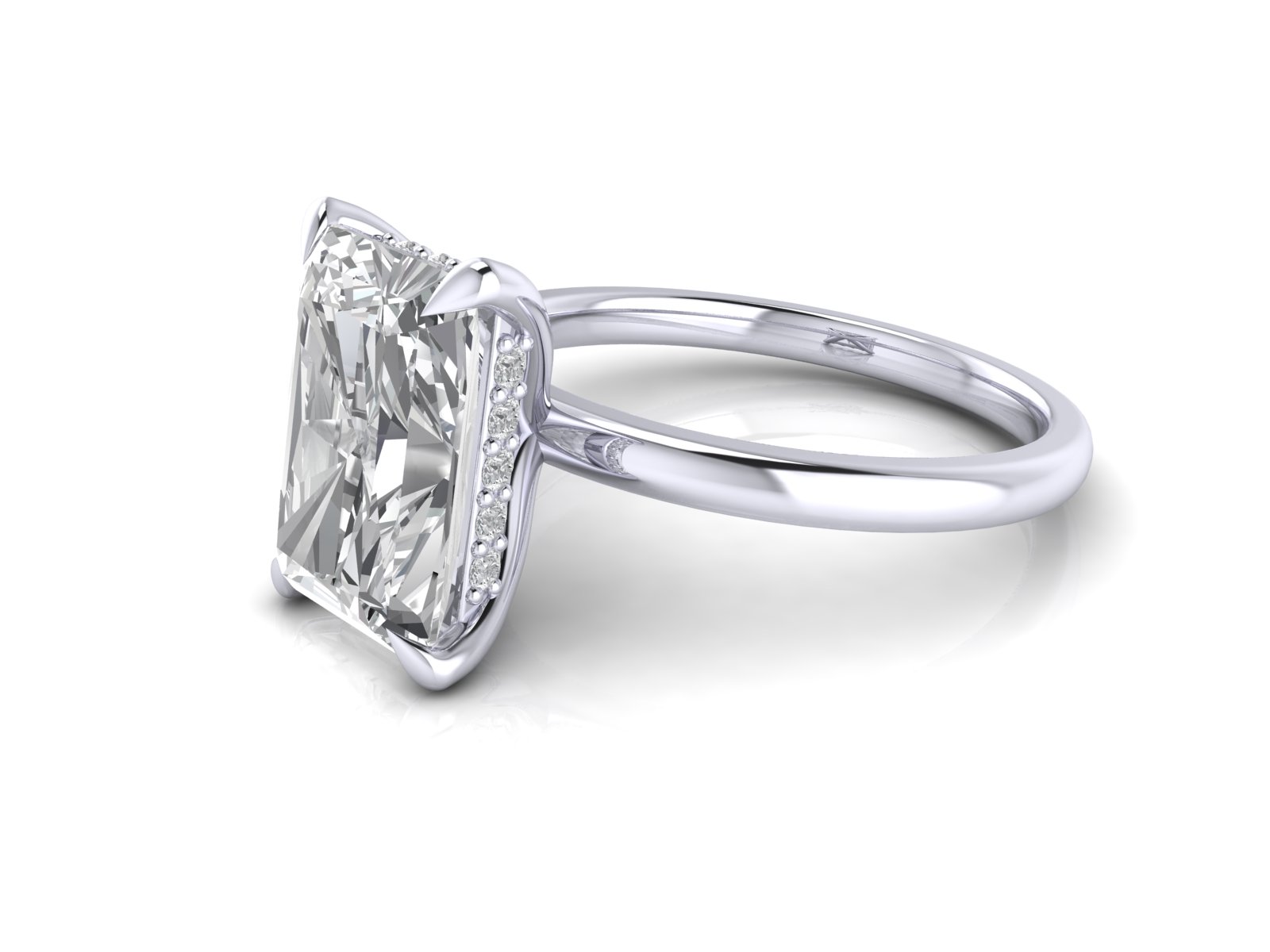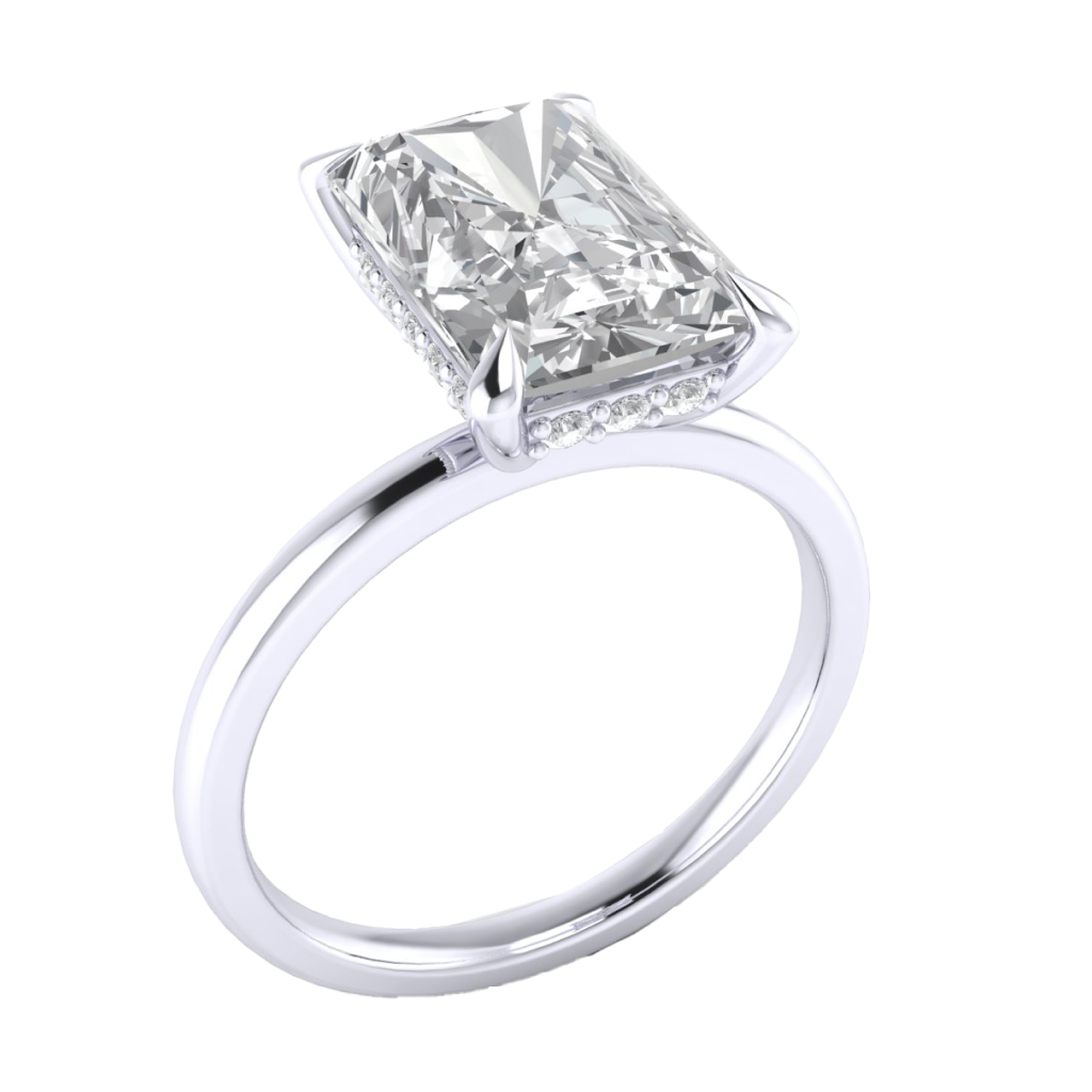 Description: This minimalist radiant-cut solitaire is enhanced by a hidden halo, adding extra brilliance beneath the centre stone without altering the classic top-view appearance. Ideal for those who appreciate understated luxury.
