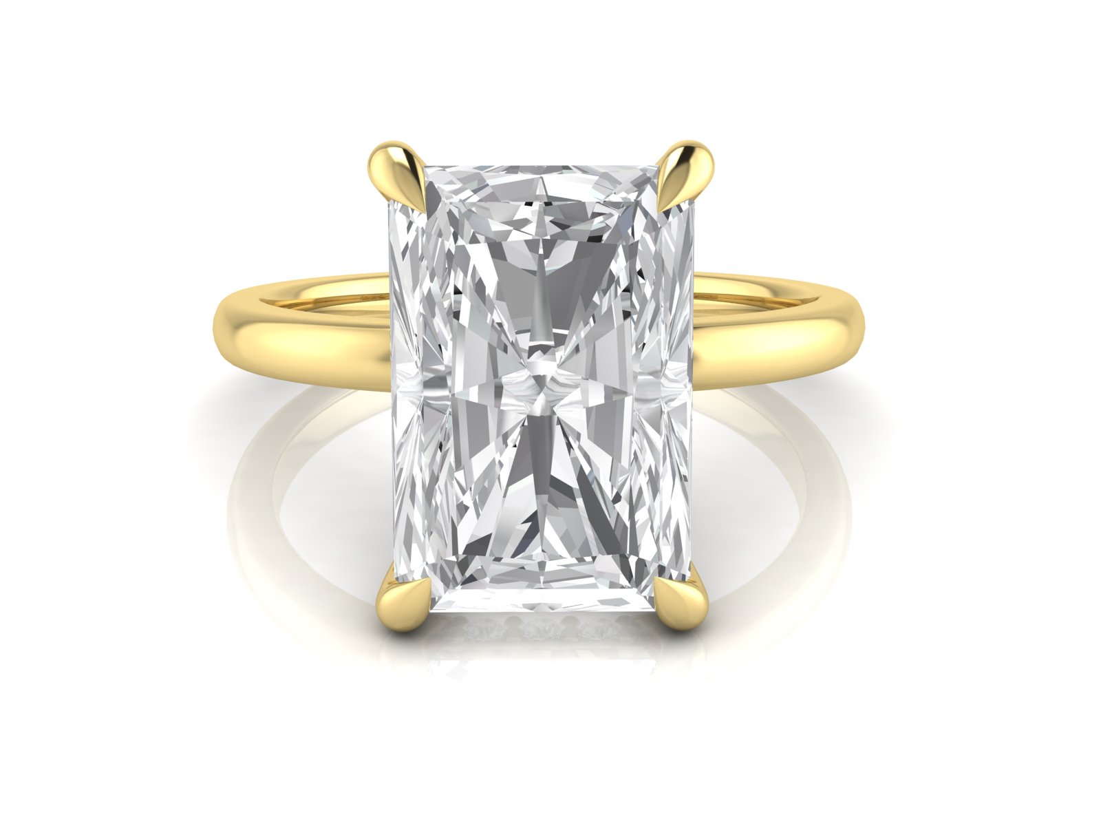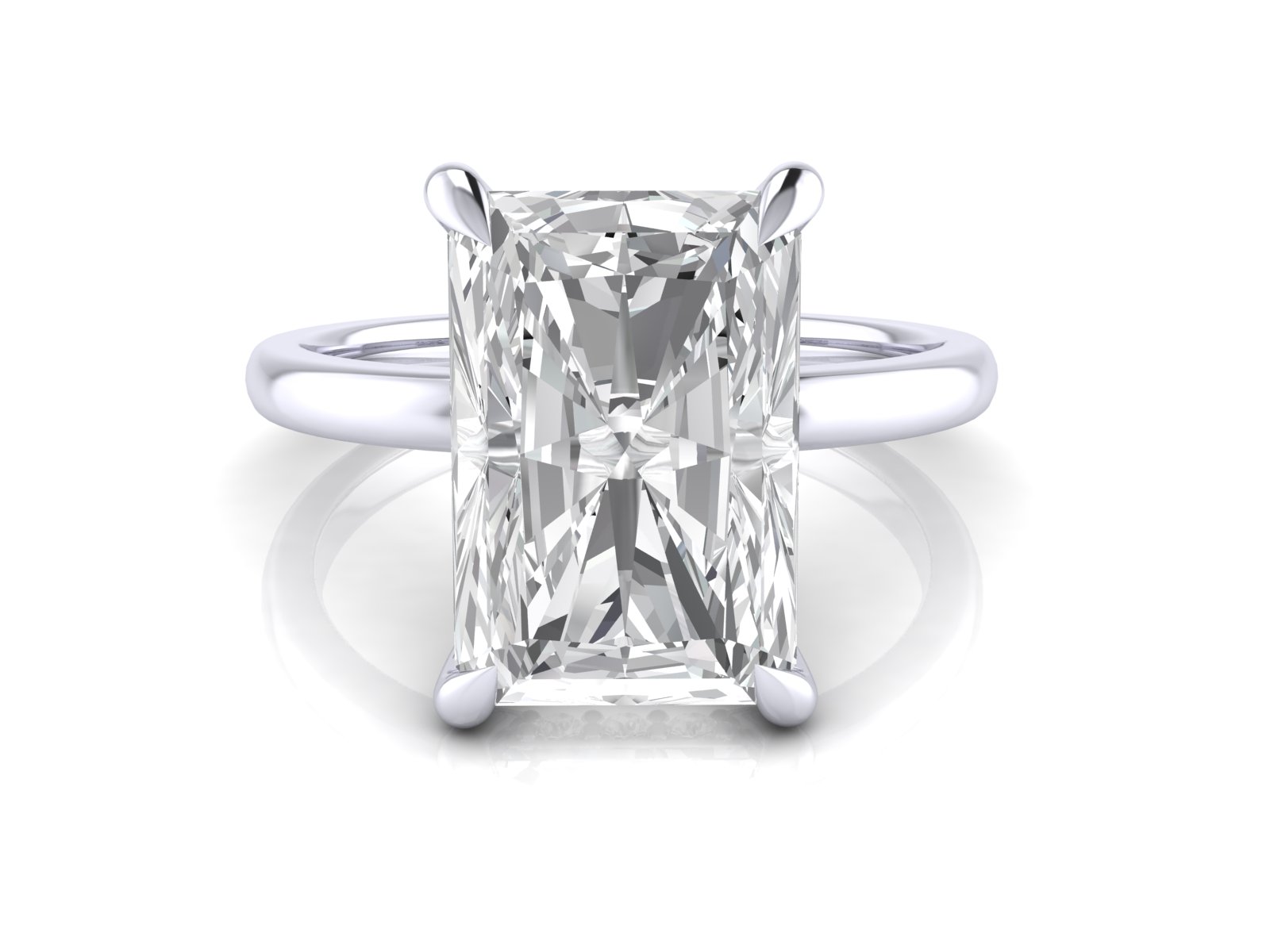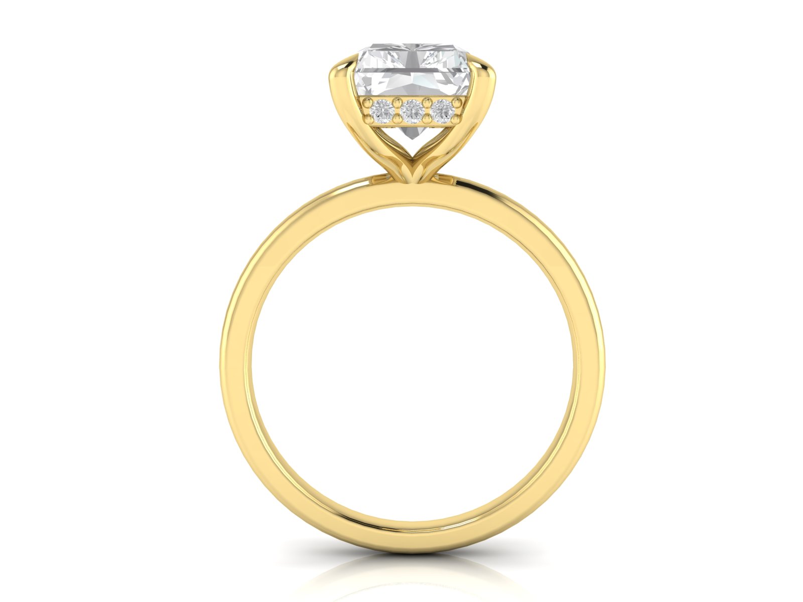 Description: This minimalist radiant-cut solitaire is enhanced by a hidden halo, adding extra brilliance beneath the centre stone without altering the classic top-view appearance. Ideal for those who appreciate understated luxury.