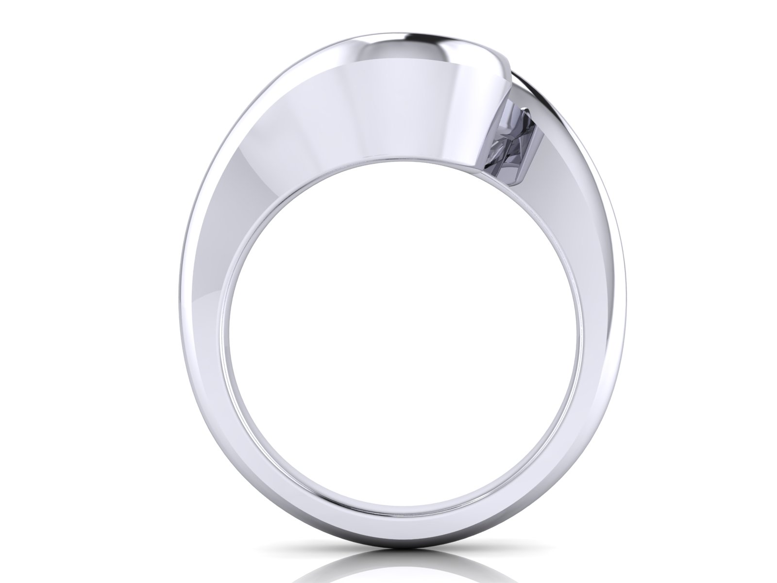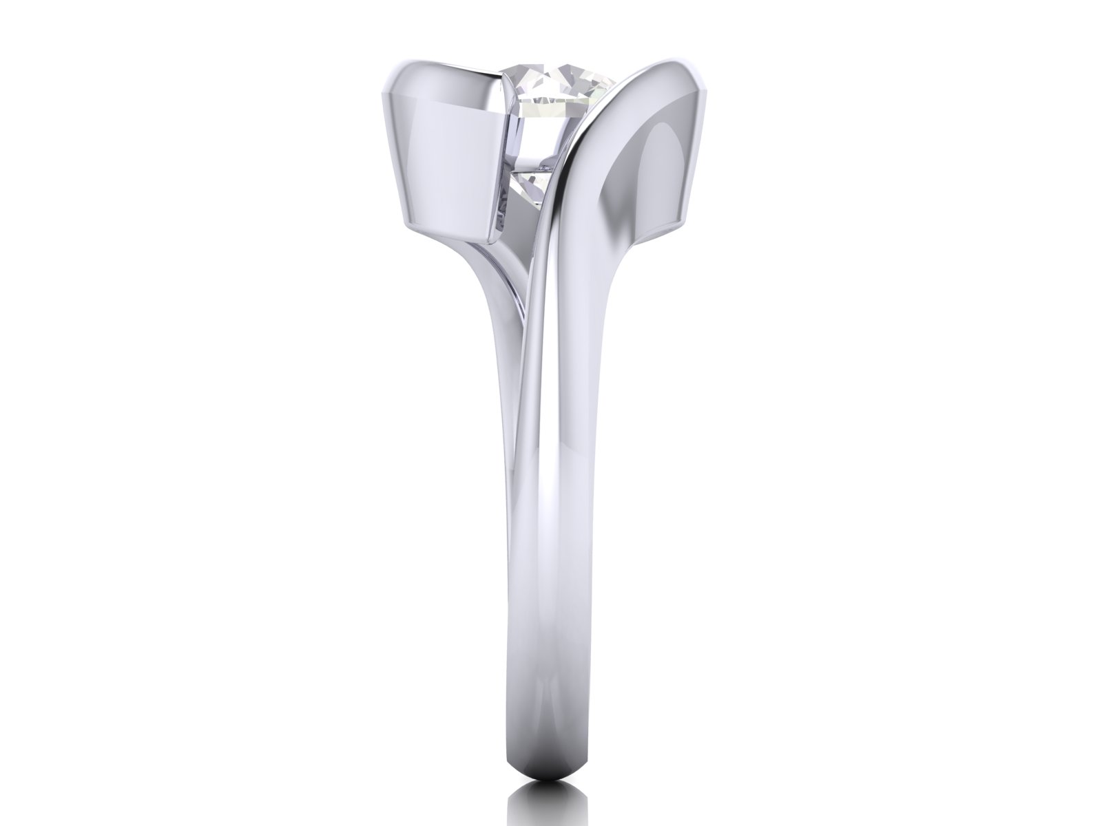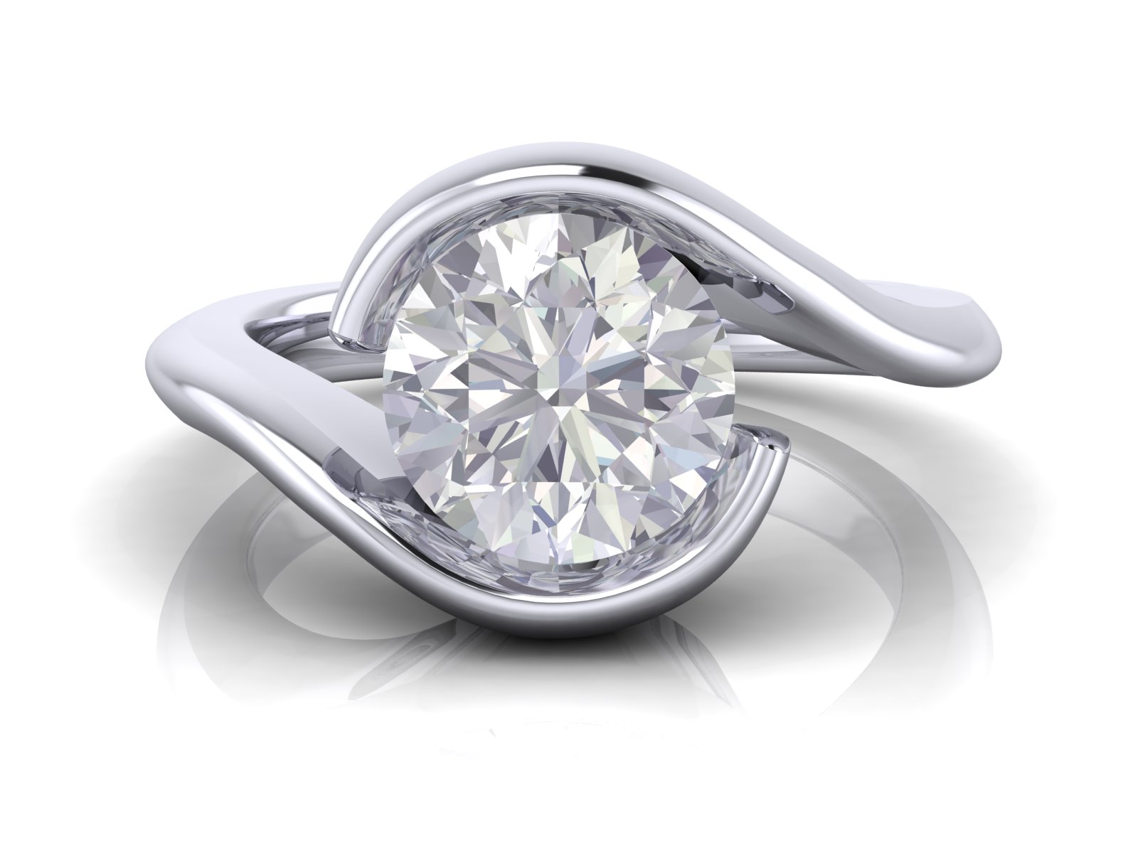 Description: A modern, sculptural design featuring a round diamond held in a sleek tension-style bezel setting. This creates the illusion of the diamond floating between the band, offering a contemporary and secure alternative to traditional settings.